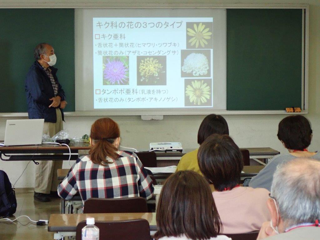 今日の座学はタンポポである。講師の木村先生が大学生以来ずっとタンポポの調査に携わっておられ植物学の面からだけでなく名の由来、方言・古名、文献、花言葉、いろんな目的での使われ方などクイズを交えた多岐にわたる話とタンポポ調査による日本在来種と外来種の分布状況、分布状況の変動の要因分析など実態に即した内容で皆さんにはタンポポの見方と知識がプラスされたのではないでしょうか。