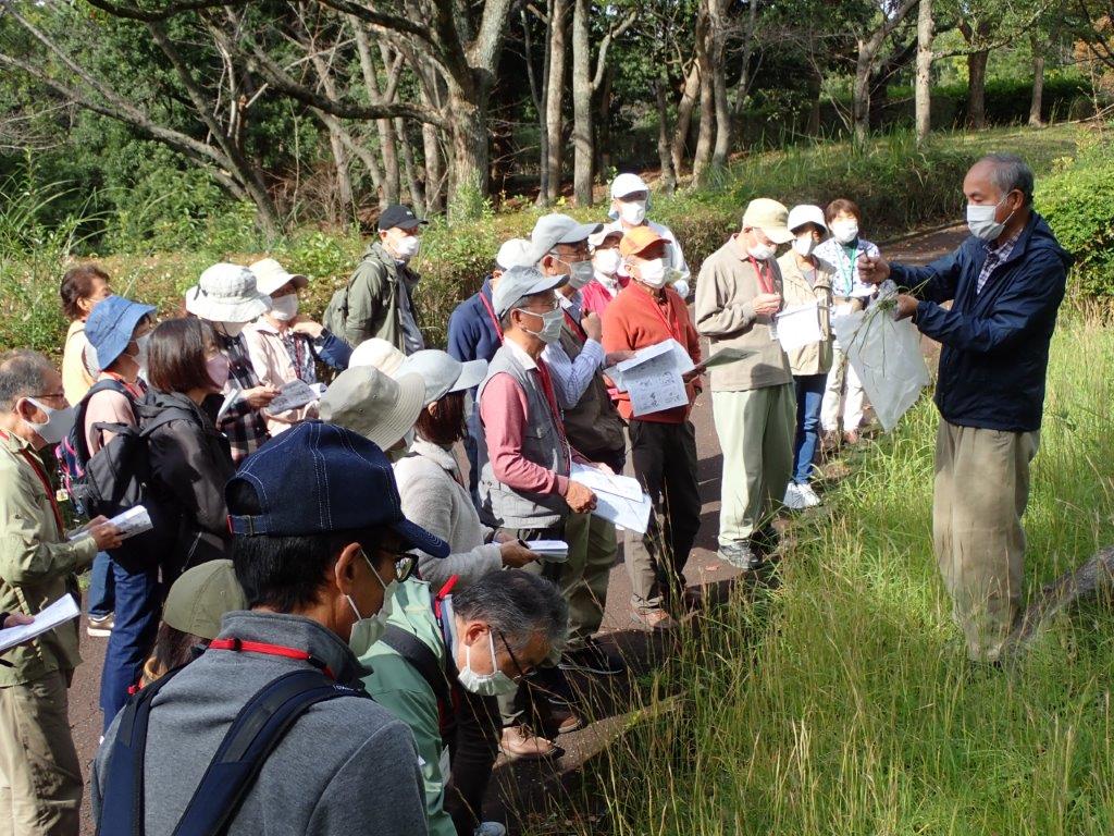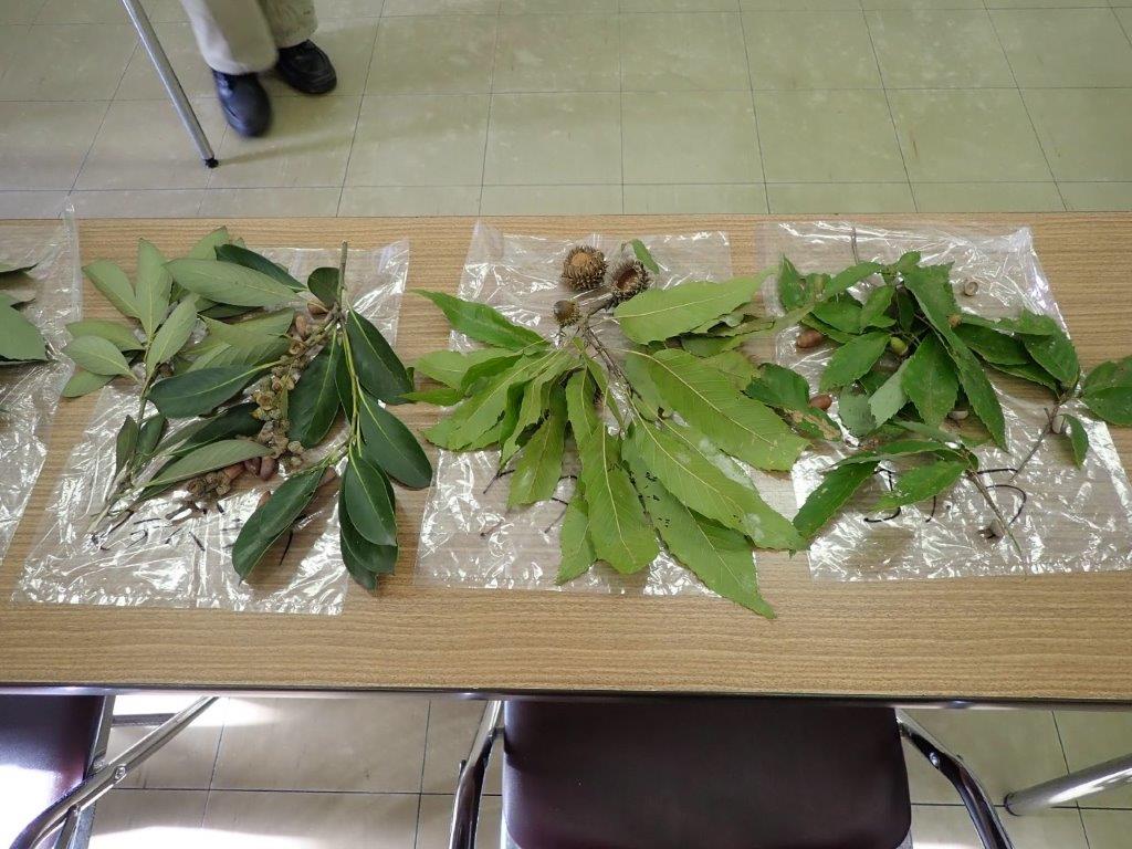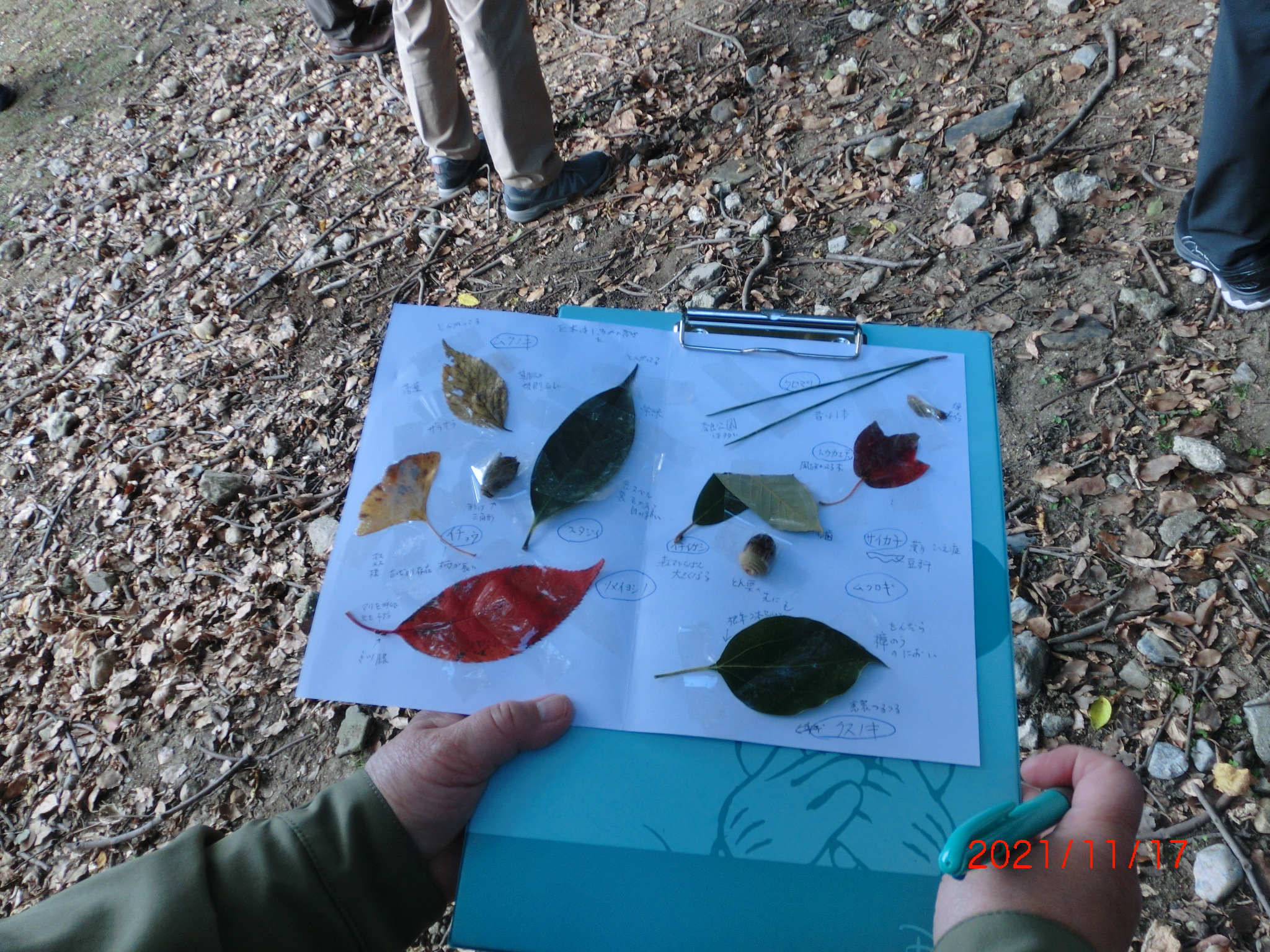 野外学習ではドングリの見分け方。ドングリの実だけでの判断は難しいのでそれぞれのドングリの特徴を実と殻斗と葉の3点セットで見分けます。今日の講座は従来、春に実施しているがコロナ禍の影響で花が無いこの時期となったが先生の配慮により実のある講座となりました。