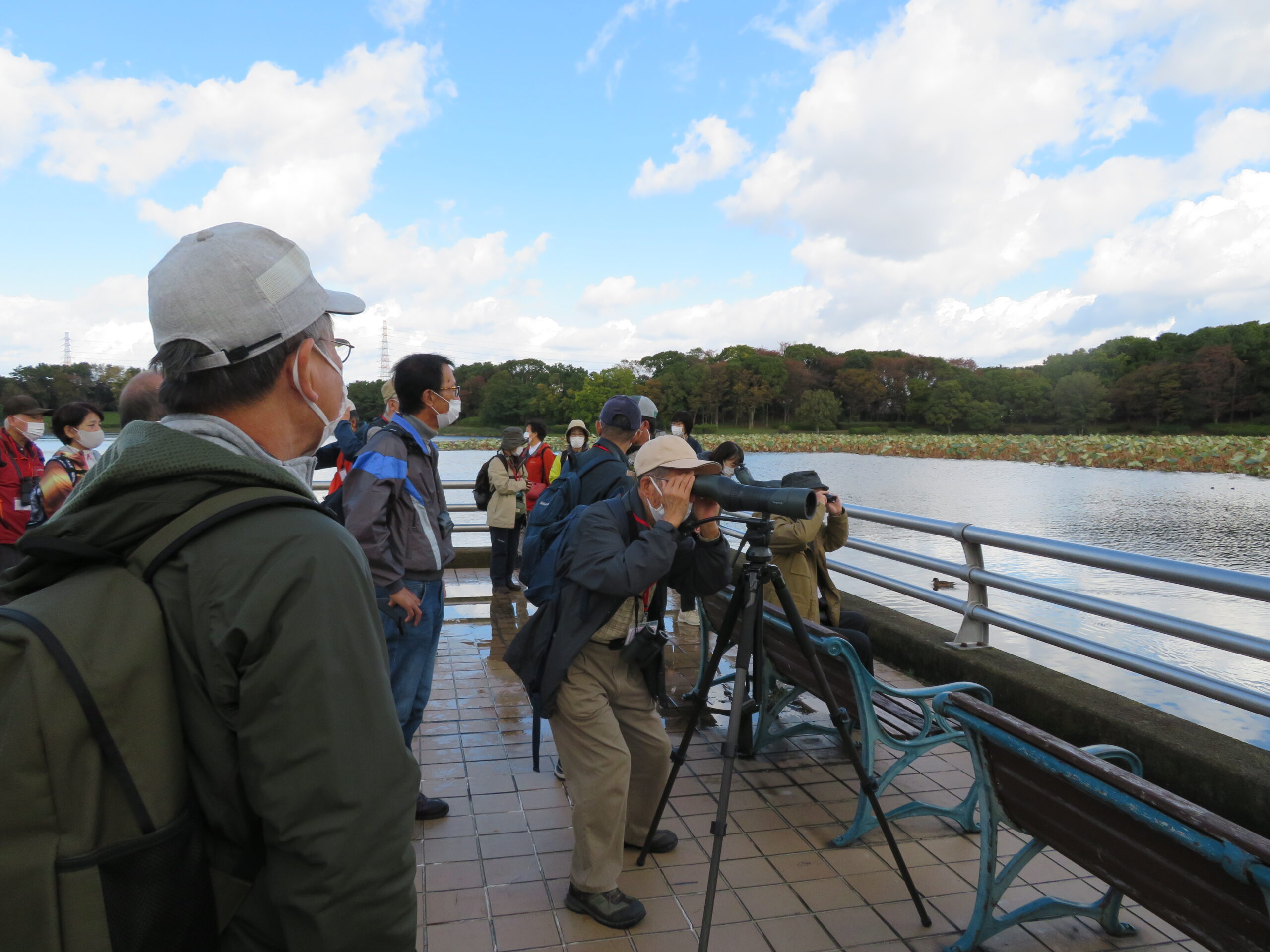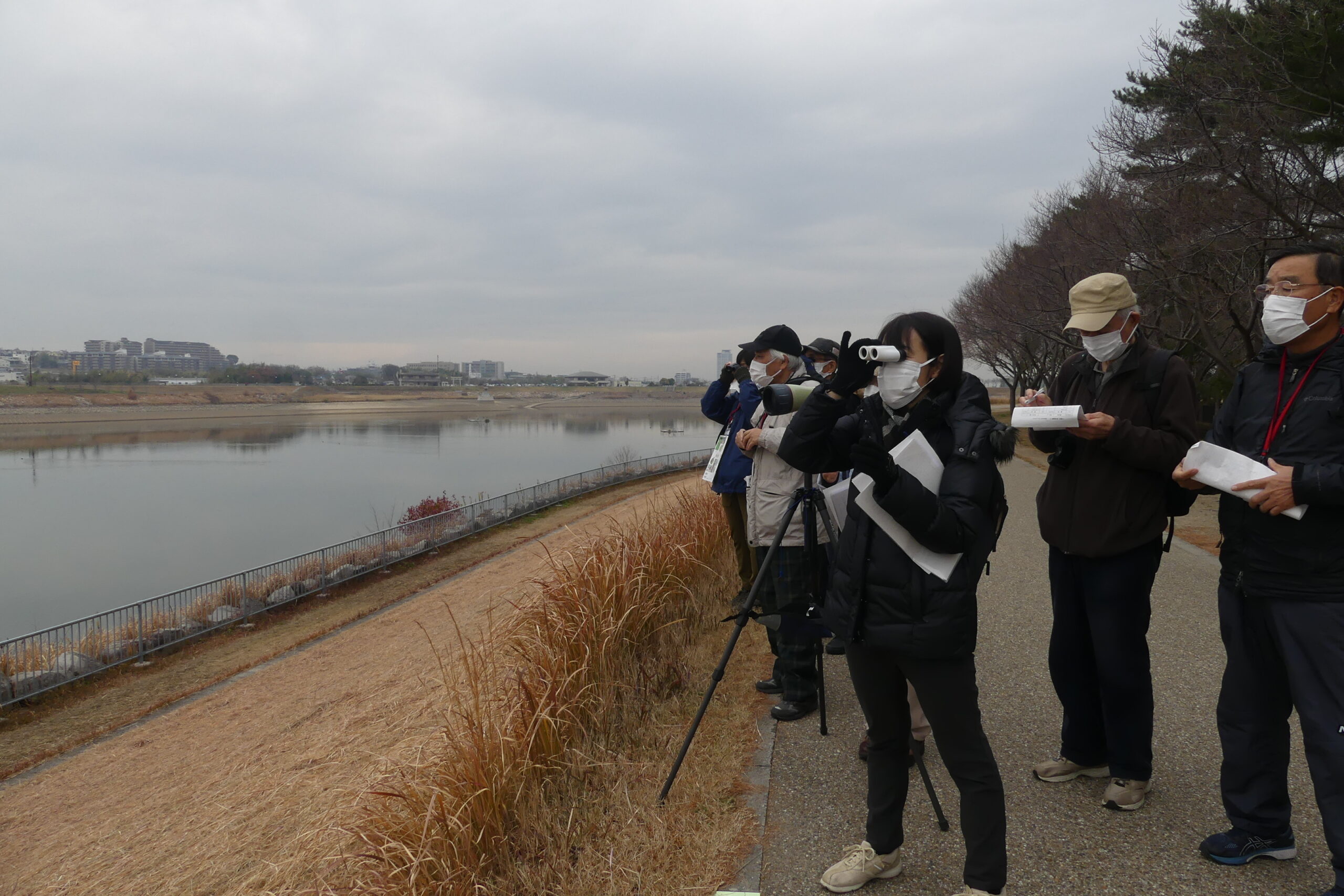 まず、水面のカモ類の観察からスタートした。池の水が少なかったが、マガモ、オカヨシガモ、カンムリカイツブリ、コガモ、ヒドリガモなどを見ることができた。この池は藻を食べる水面採食ガモが多いそうで、潜水採食ガモとの違いやまた、留鳥・漂鳥・冬鳥についての説明も受けた。たくさんの人が双眼鏡を持参され、熱心に観察されていた。茂みの多い所では、ハクセキレイ、キセキレイ、アオジ、ツグミ、カワラヒワ、イカルチドリなどが見られ、計32種類の鳥の見ることができた。突然ミサゴが現れ、ホバリングしている様子を観察できたり、病院の看板の上にハヤブサが見られ、感動的だった。鳥の名前や生態に詳しい人もおられ、話しが弾む様子も見られた。