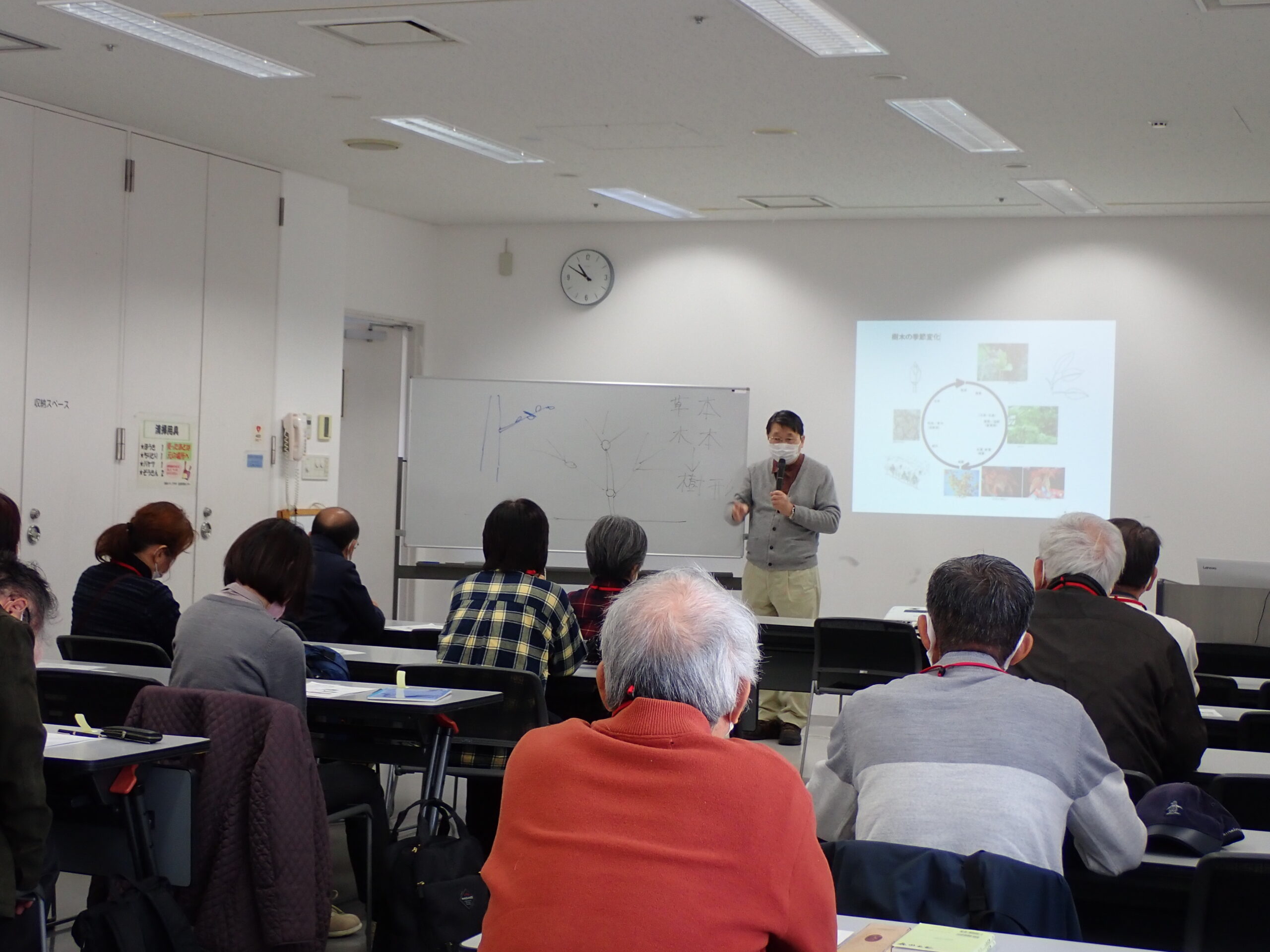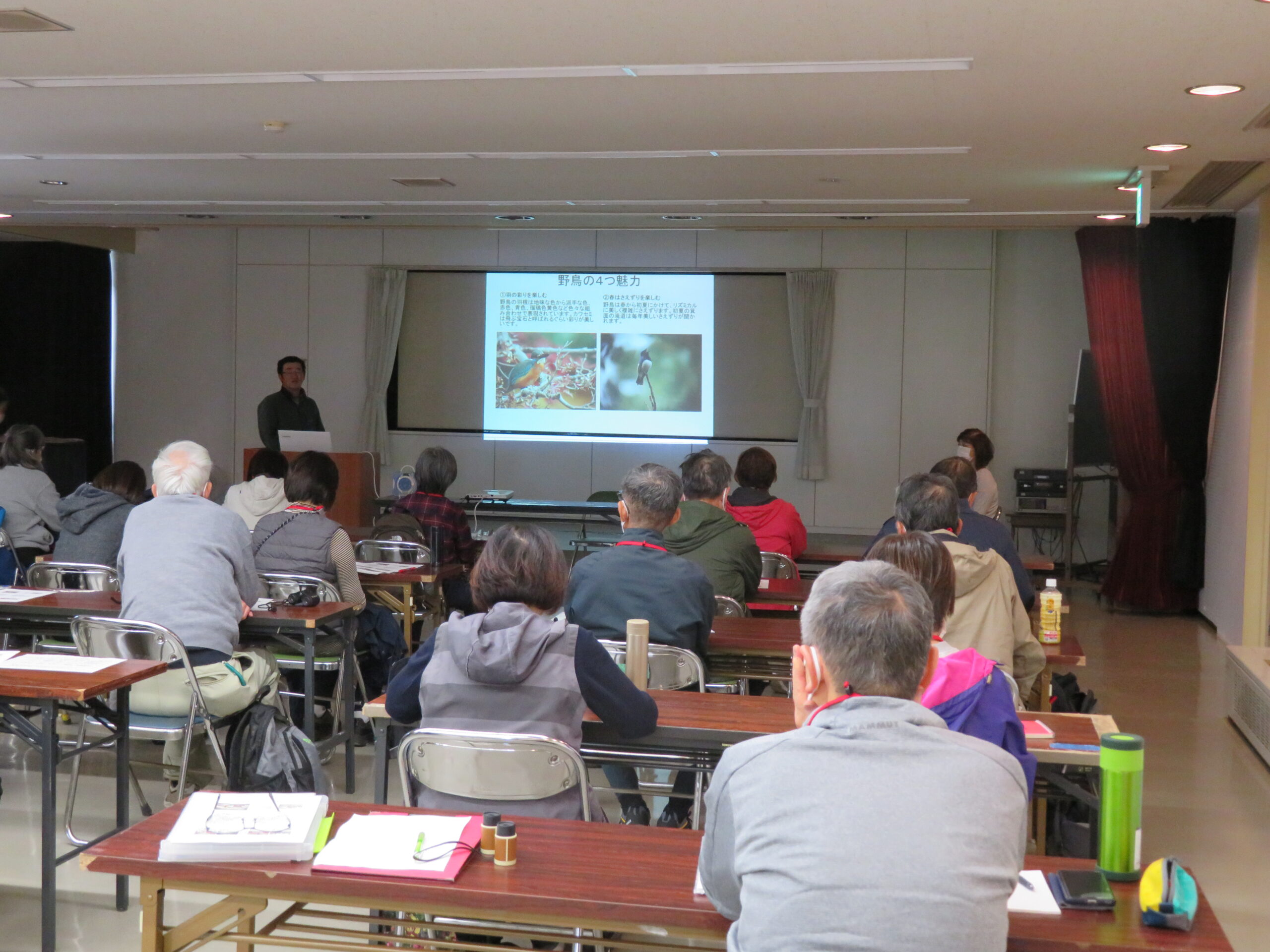 午後からは座学で、野鳥の魅力とバードウォッチングの基本となる鳥(ものさし鳥)、留鳥・夏鳥・冬鳥・旅鳥についてなどのレクチャーと、大阪で見られる野鳥の紹介も受けた。初心者の図鑑はイラストのものが使い易く、チャームポイントや観察日時を書き込んで「自分の図鑑」にしていくことを勧められた。「この講座を楽しみに双眼鏡を買いました」とか「退職の時に買った双眼鏡がやっと日の目に合いそうです」と言う声も聞かれた。(Y.S)