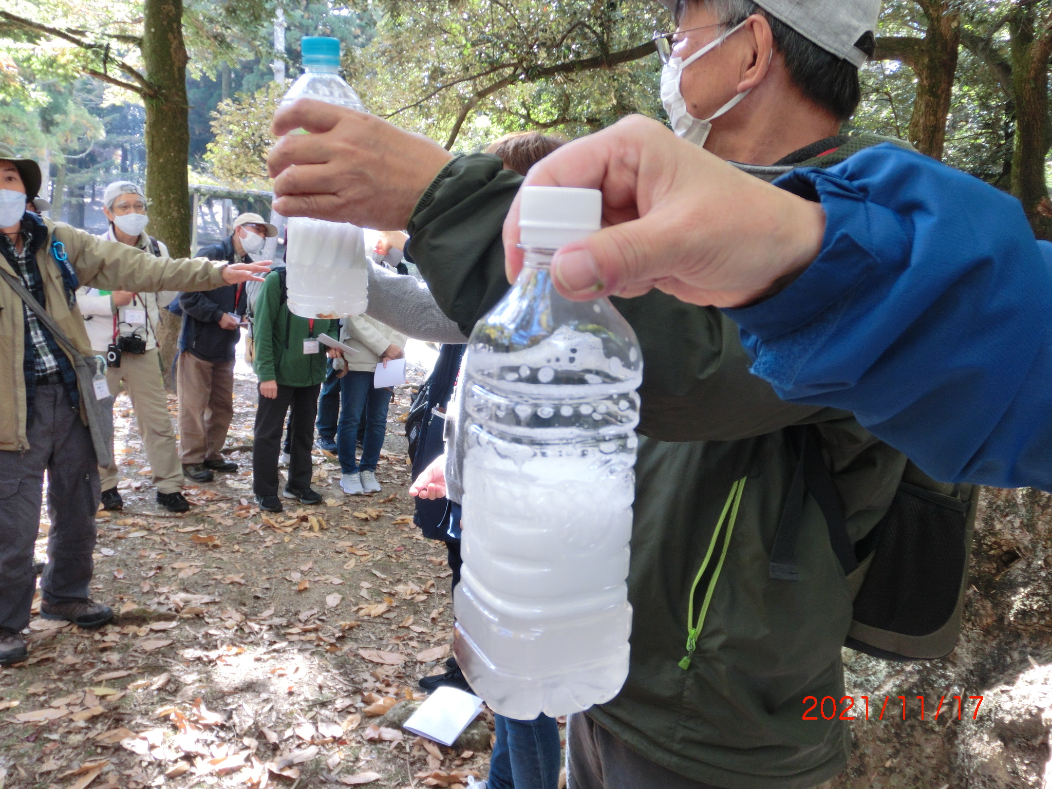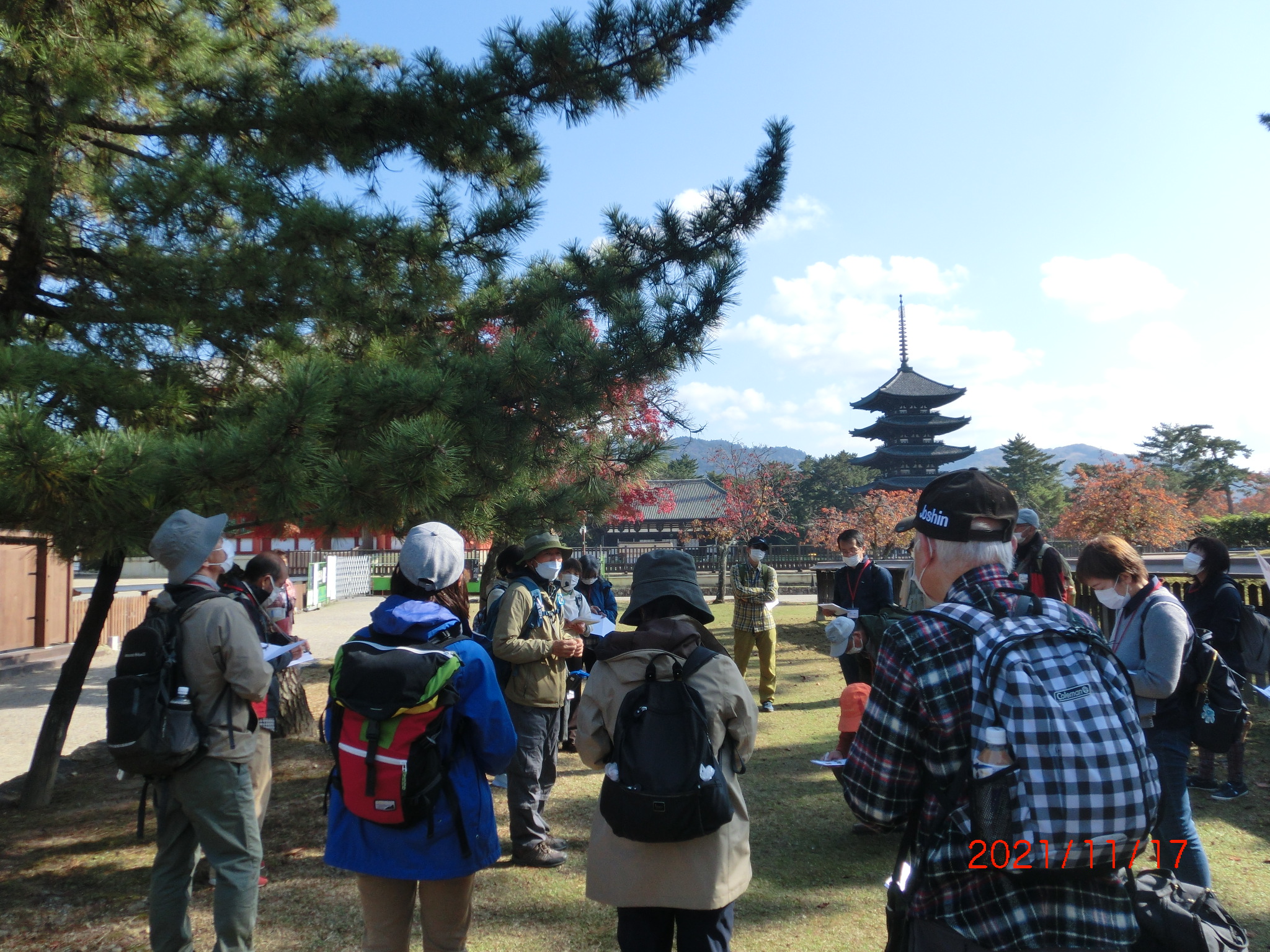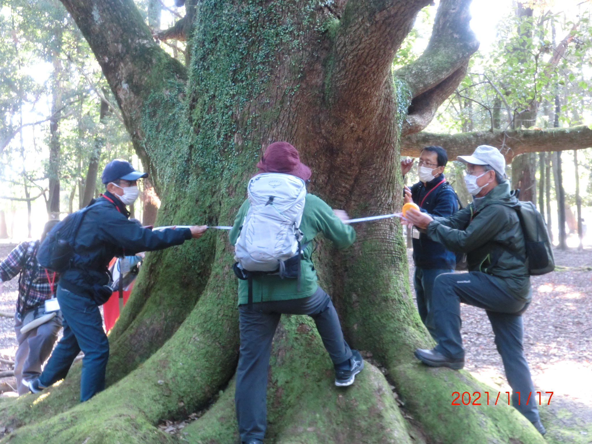 午後は、飛火野から春日大社周辺の巨樹巡り。幾つかのクスノキを、交代しながら測って、巨樹を体で感じる事が出来た。又、とてもいいお天気だったので、春日大社のご神体である御蓋山や遠くの春日山原始林まで見渡せて、クロマツの巨樹を見ることも出来た。(Y.S)
