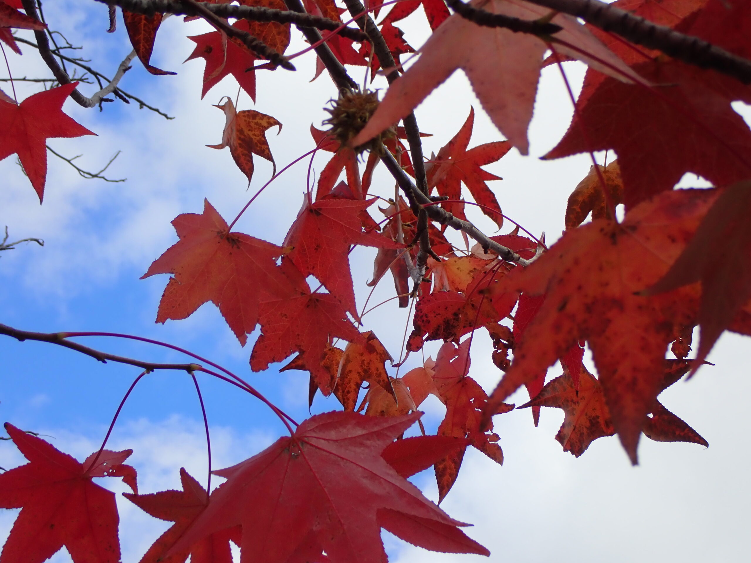 今日は予想最高気温が13℃と12月中旬の気温で、この寒さが一段と木々の紅葉、黄葉を色鮮やかにして私達の目を楽しませてくれている。緑色の葉が紅葉、黄葉、褐葉に変化する仕組みや樹木にとって、どんな意味が有るのかを知ることにより樹木の知恵を見ることが出来る。落葉樹は冬芽で寒い時期を過ごし、春に枝葉を成長するための栄養分を秋に葉の中の栄養分を回収する過程でいろいろな色素が作られたり葉緑素が分解されて葉の色が変わり最後に葉柄の基部に特殊な層をつくり落葉する。美しい紅葉になる為の3要素は日光、低温(氷結しない程度)、温度差である。
