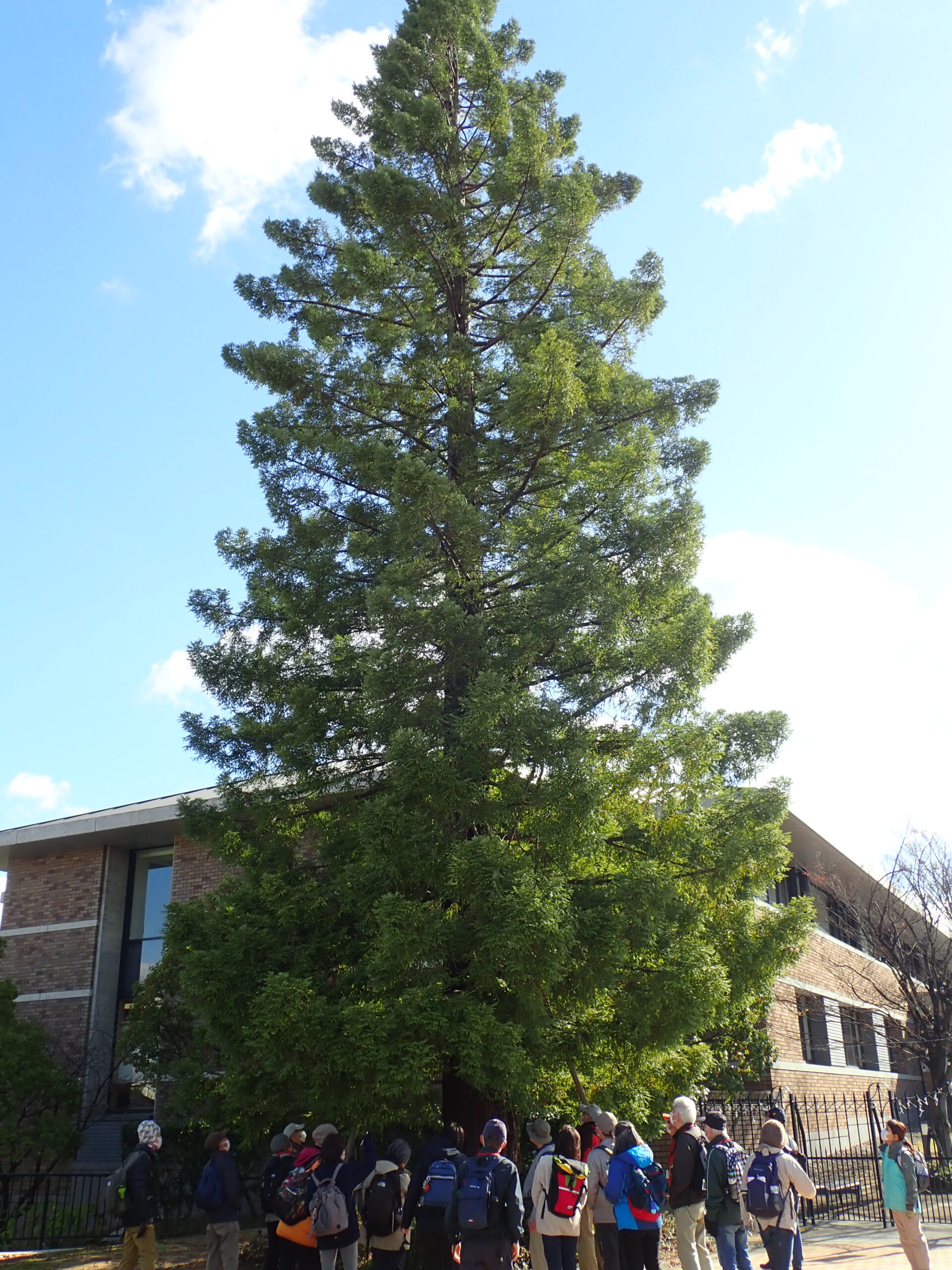 野外ではケヤキやトネリコの実を飛ばしたり、常緑針葉で高木のセンペルセコイアの高さを先生が手を上に伸ばしたら2mになるので、それで計測したり、サクラの枝の樹齢を調べる方法やアメリカフウの葉や実の観察、クスノキのダニ部屋の話や観察、紅葉したカエデの色の違いで太陽の方角を考えてみるとか先生の多様な知識で楽しむことが出来ました。後半に少し雨に降られましたが先生の話好きの影響か?予定のコースを回りきることは出来なかったが秋の紅葉を満喫出来た講座となりました。お疲れ様でした!(T.O)