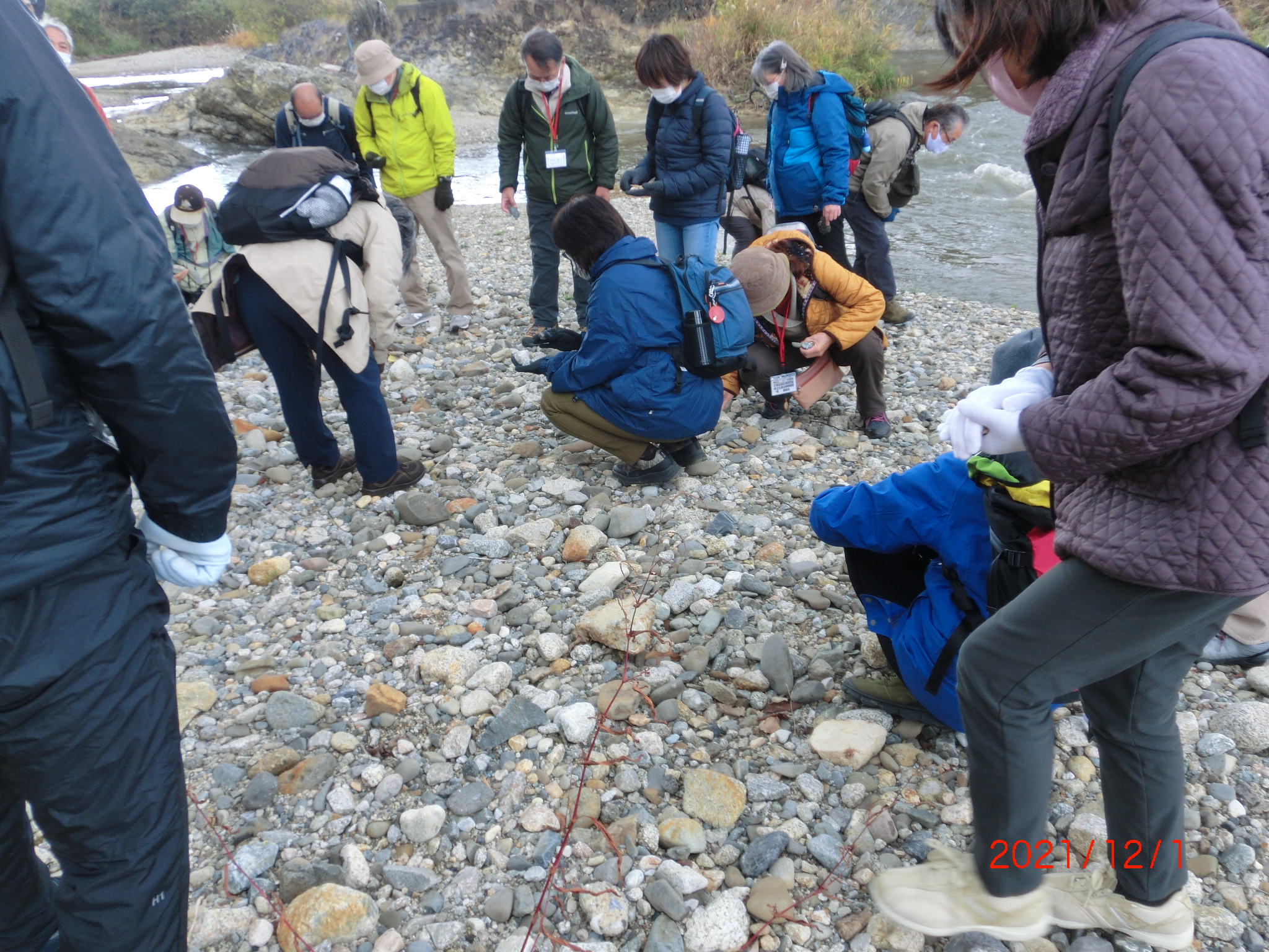 その後汐ノ宮公園、千代田神社へと異動しながら、石川の周辺の平坦な地形と段の様子を観察し、平坦部は古い年代の河川敷であること、浸食・堆積と隆起を繰り返して何層にも河岸段丘が見られることがわかり、TV番組の「ブラタモリ」の世界の一端を実感できたようでした。河原への通路の確保等、準備いただいた先生に感謝しつつ終了しました。寒い中お疲れ様でした。(Y.S)