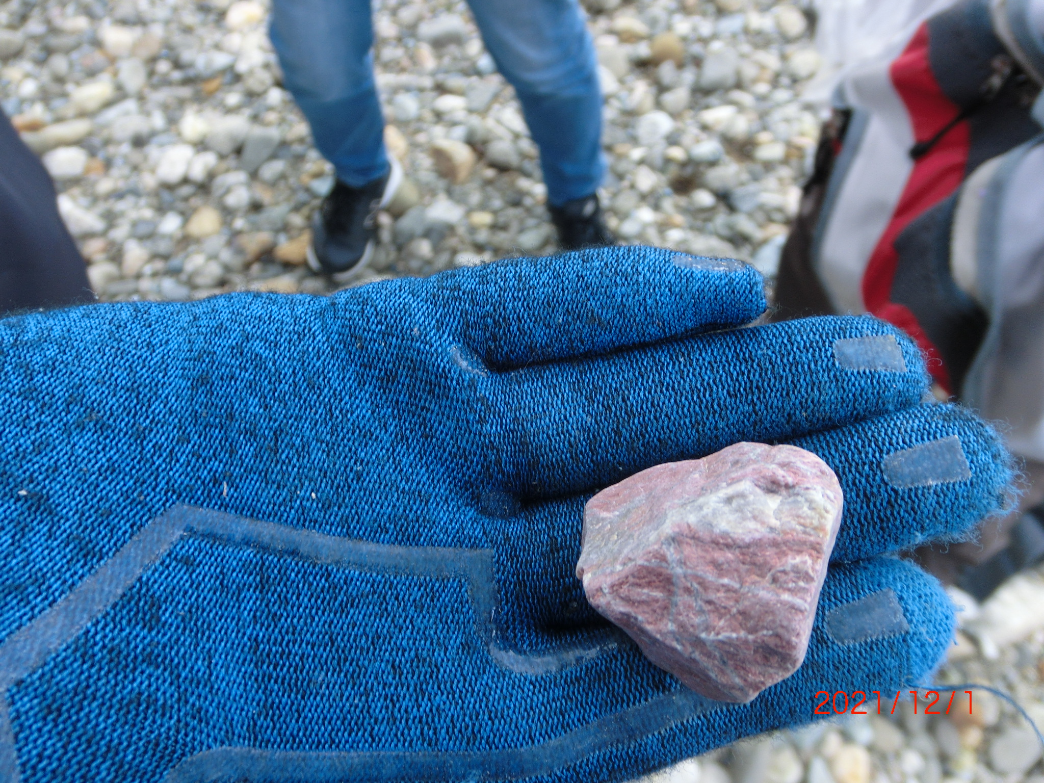 河原で花崗岩・砂岩・チャート・礫岩・流紋岩・石英等を拾い、見分け方を学びました。チャートは色が豊富で美しく人気でした。また、安山岩の中に含まれるカンラン石はローマ人から宝石ペリドットとして珍重されたそうで、割ってもらった面をルーペで観察すると小さな粒が見つかり盛り上がりました。