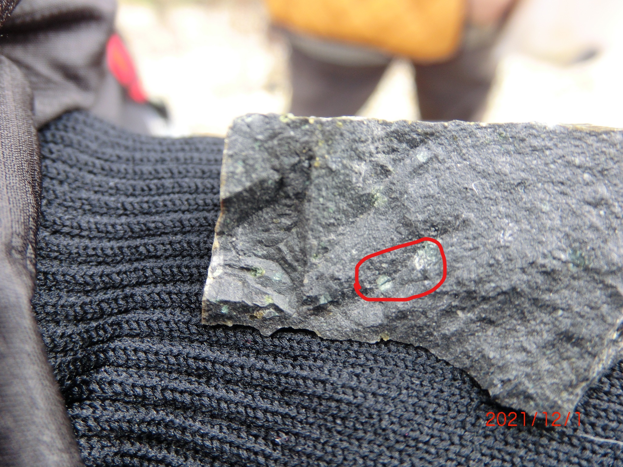 前夜の雨で石川は水かさを増し、予想最高気温13度、風速7メートルで河原での観察は厳しい条件下でした。増水のため1500万年前の溶岩の露出部は中州状になっており近づけず、また安山岩の柱状節理も炭酸ガスの湧出部も少し遠くより見ることになり、残念でした。近畿地方は若くて熱いフィリピン海プレートが沈み込み、浅い場所で脱水分解し「有馬型温泉」となり、かつては「汐ノ宮温泉」があったとのことでした。