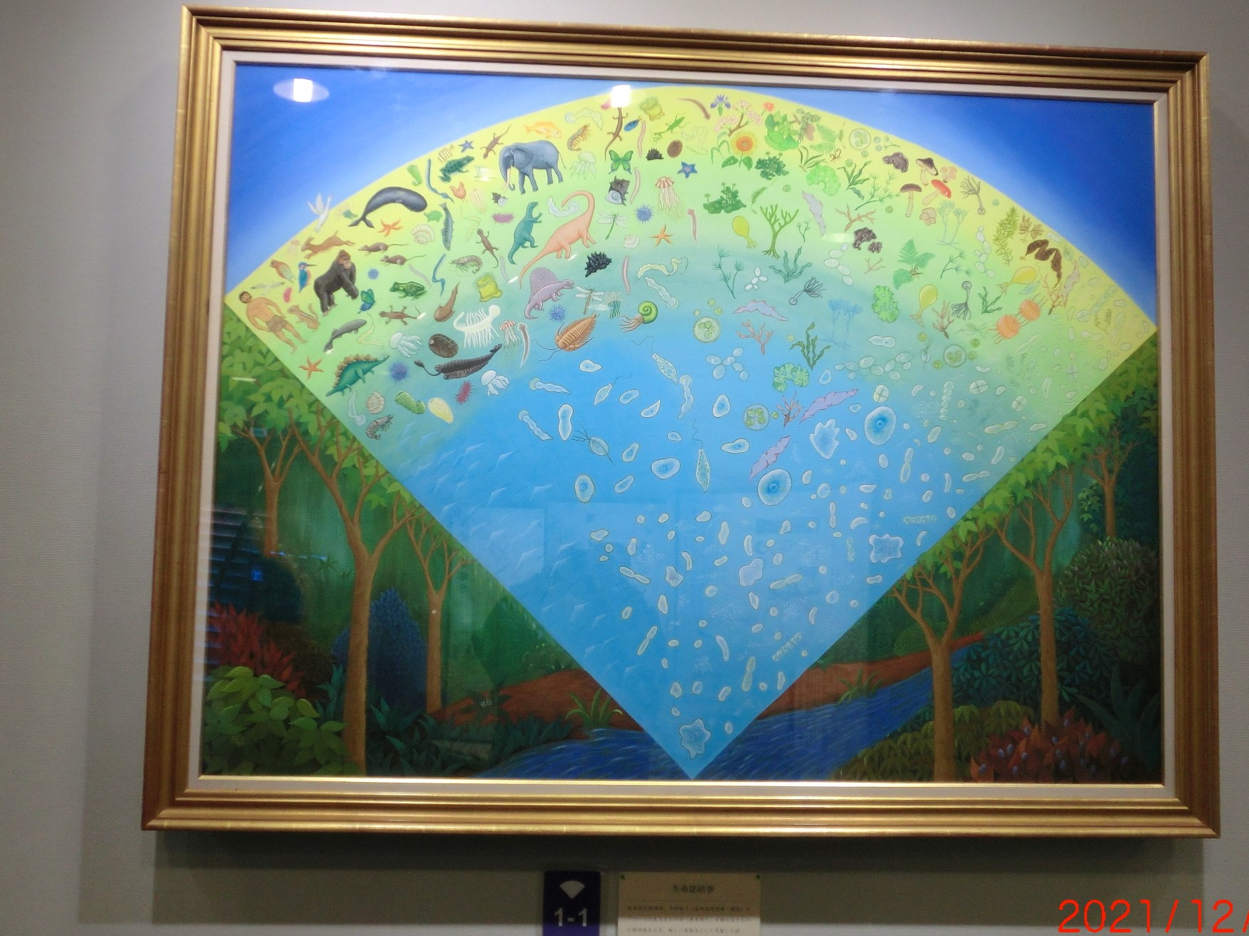 午後はJT生命誌研究館と安満遺跡公園の見学だ。人数制限の為、二班に分けての見学になった。JT生命誌研究館って何だろう?玄関に入るとシンボルとも言える“生命誌絵巻”が飾ってある。38億年前、扇の要に、ある一つの生き物が誕生し、扇の縁の現在までの歴史と多様性等が描かれている。ここは、全ての生き物の、生命の物語を研究している所のようだ。ガイドの説明に頷いたり、首を傾げたり、一度で理解するには難しい・・・でも「又来たい」との声に少しほっとした。