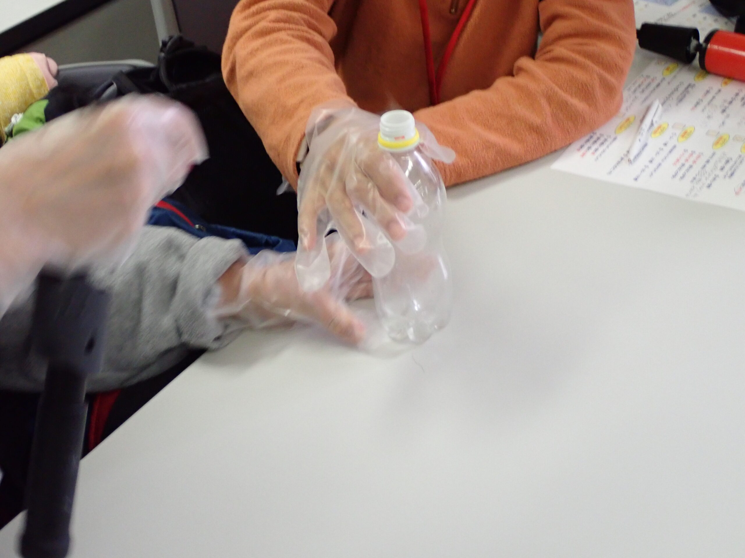 気圧を「空気の重さ」ととらえて気圧を理解する実験を体験することに。