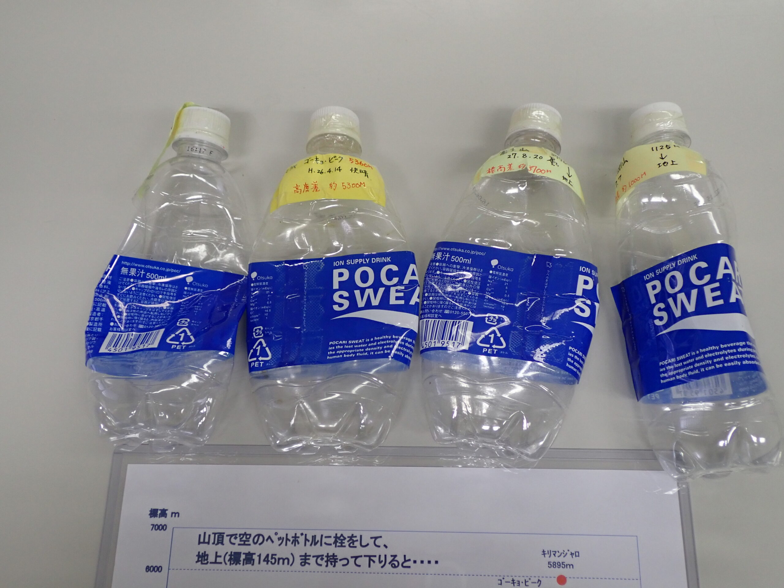 右から金剛山、富士山、ヒマラヤ、キリマンジェロの山頂から持ち帰ったペットボトル。高度の高いところは空気が少ないことが分かります。