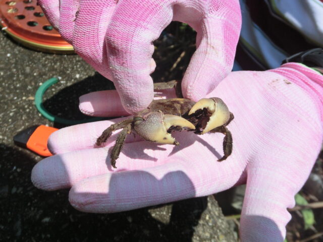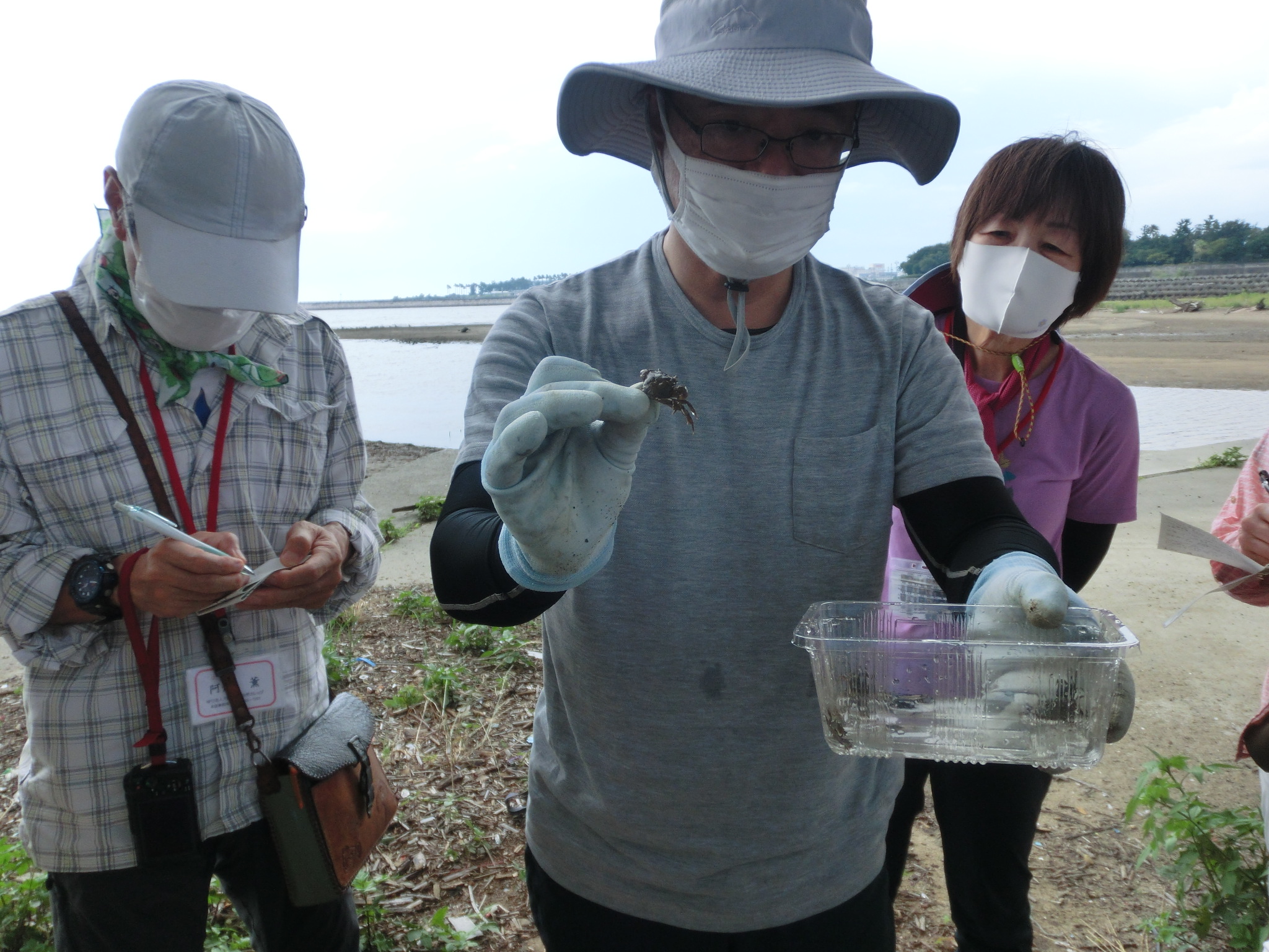 南海二色浜駅に集合し、近木川河口に向かい、河口の葭原でカニ釣り体験をした。短い竿に各自たこ糸を結び、餌はチクワ、スルメ、ソーセージで開始し、クロベンケイガニ、ハマガニ、アシハラガニの3種類のカニが釣れた。葭原の中やコンクリート土手の下に隠れていたり、葭原の泥の穴にいて付近に餌を置くと顔を出してくるカニもいた。餌は食べるが、葭がひっかかっり途中で落ちてしまう等、釣り上げるのは一苦労だった。クロベンケイガニの脱皮したての脱皮ガラも見られた。脱皮後1日もしないうちにまた黒くなるそうだ。