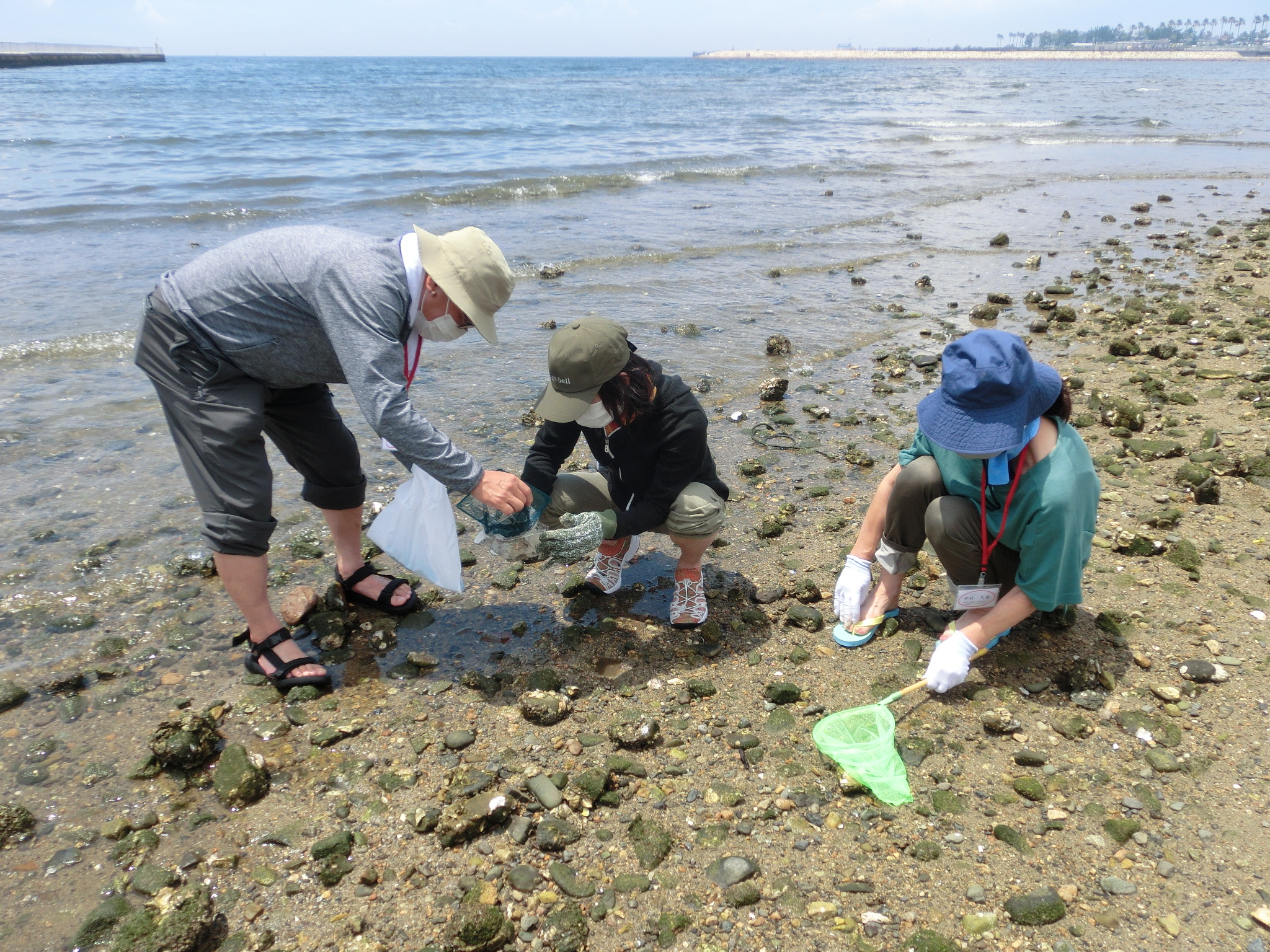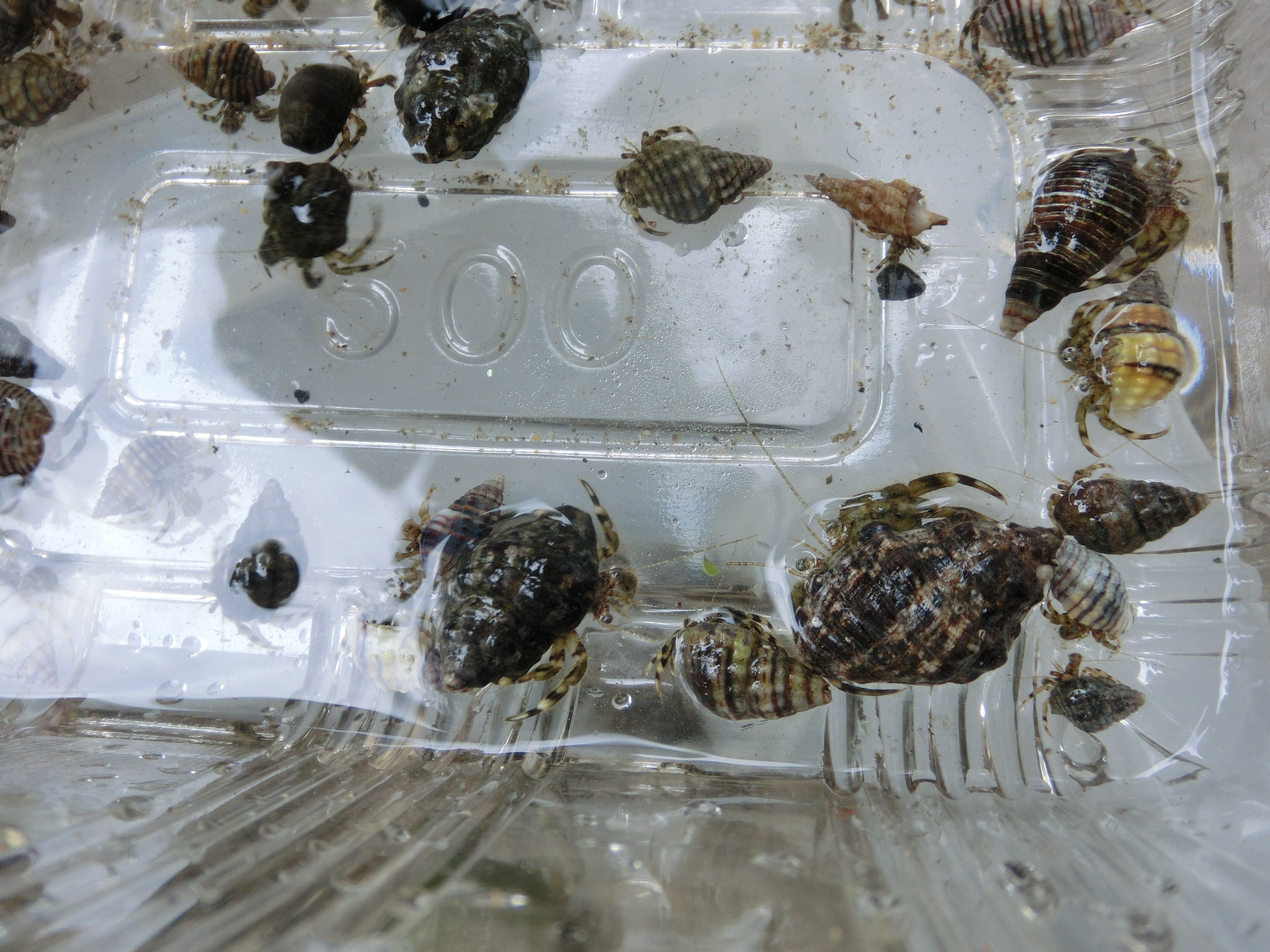 二色浜では磯の生物採集と観察をした。カニは2種類採集し、同定によりヒライソガニ(甲羅が平たく色や模様は個体差がある)とケフサイソガニ(ハサミの根元に房状の毛がある)を観察した。ユビナガホンヤドカリが沢山採集でき、素早い動きに驚いた。ハクセンシオマネキ、亀の手や淡黄乳白色のヒモイカリナマコも見られた。二色浜はアマモの自生地としては大阪湾の最北端、フジツボは赤ちゃんの時は動くこと説明を受けた。(T.U)