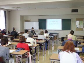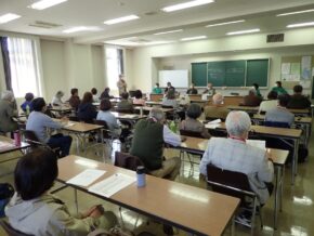 座学は木村先生の泉北高校でのライフワークであるビオトープ池の造成から現在までの池の変遷、動物、植物の生態の変化や変わりゆく池の表情などと、生徒達と収集したPH、水温、水位、水質等の蓄積されたデーターに基づいて現場で携わってきたお話を興味深く聞くことが出来ました。四つ葉のクローバーの確率は1万分の1といわれるが生徒達が実験研究して3割が四つ葉になるシロツメクサの鉢がありました。