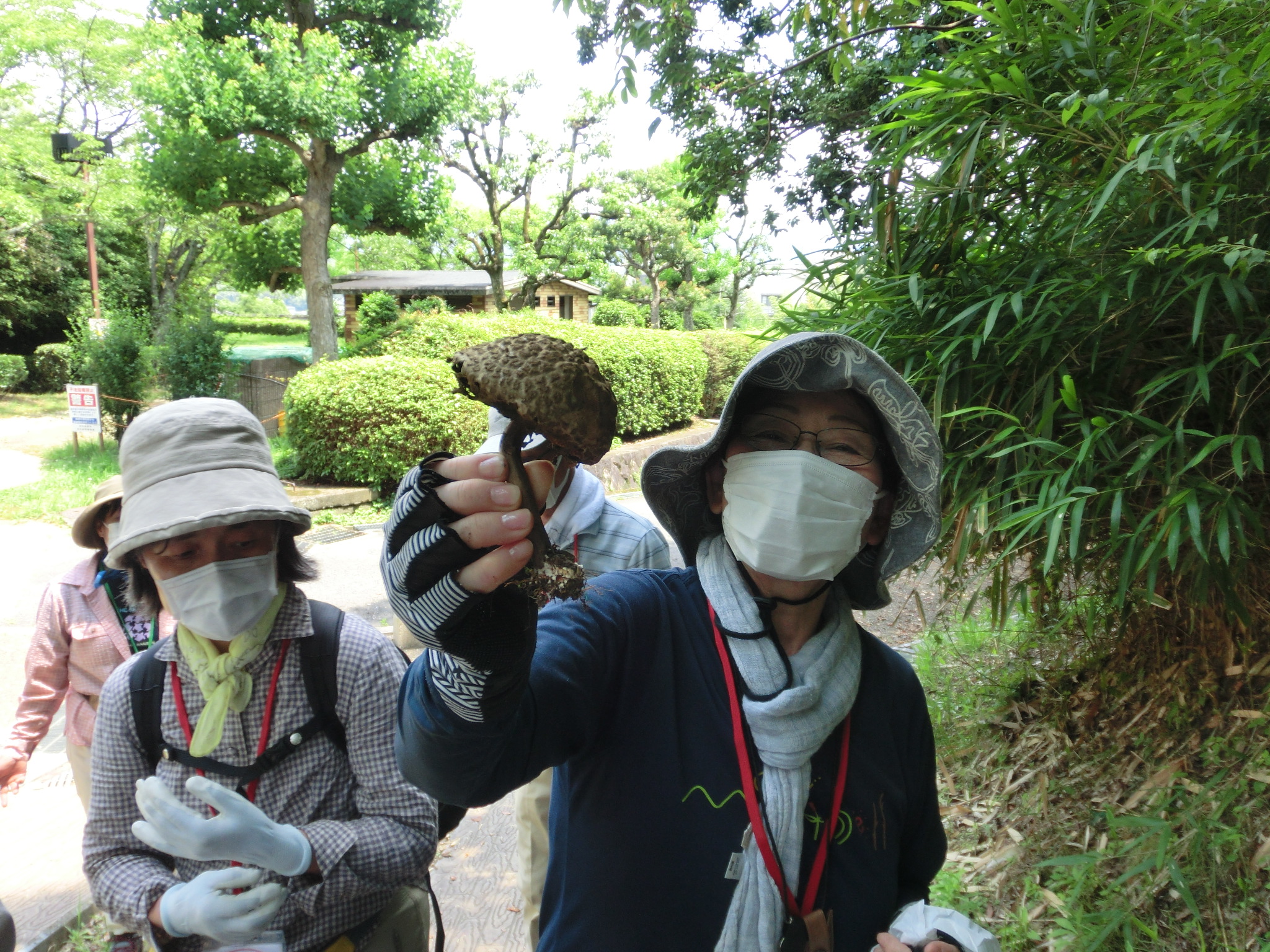 午後、烏帽子形公園に移動して、先生と共に採取をスタートした。歩き始めるとすぐに声が上がる。大きなキノコを発見し、早速採取!この時期は秋と同じくキノコのシーズンだそうだ。その後も白・茶・薄桃・黒色など形も大きさも様々なキノコが次々見つかった。
