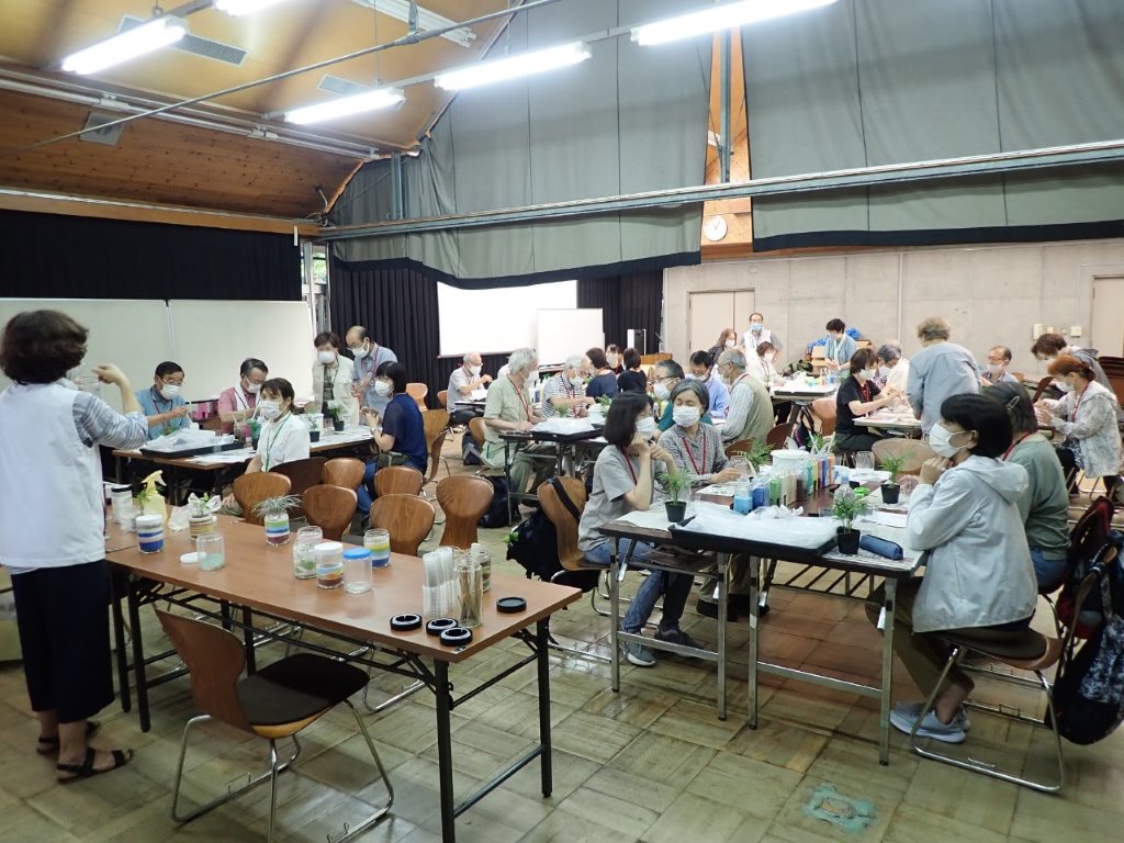 観葉植物の効果として、部屋が明るい雰囲気になりホットした落ち着いた気持になる。これは緑の色が安心・安定の色で生理的・心理的効果を持っていることによる。そして、素敵なインテリア、空気清浄や加湿調整効果、植物を育てる喜びがプラスされる。今日はこの効果を体感しようと観葉植物を土の代わりにハイドロボールを植込み材に使い鉢底に少しだけの水をためて育てる方法のハイドロカルチャーでテーブルヤシとカラーサンドで観葉植物つくりを 井上先生から作り方のレクチャーを受けた後スタート!