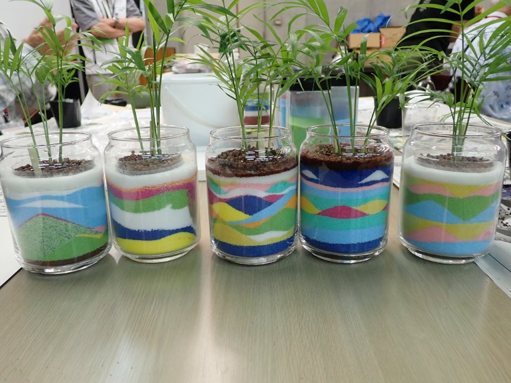 鮮やかなカラーサンドが10種類以上並んでおり、どの色でどんな模様を?全色を使う人、5~6色の人、ナチュラルな砂の流れ模様、山を描く、色と形を細かく組合せた模様など自分好みの観葉植物作りを楽しみ、先生からお褒めの言葉も頂き全員が満足してニッコリ!枯らさないようにして長く楽しもう。