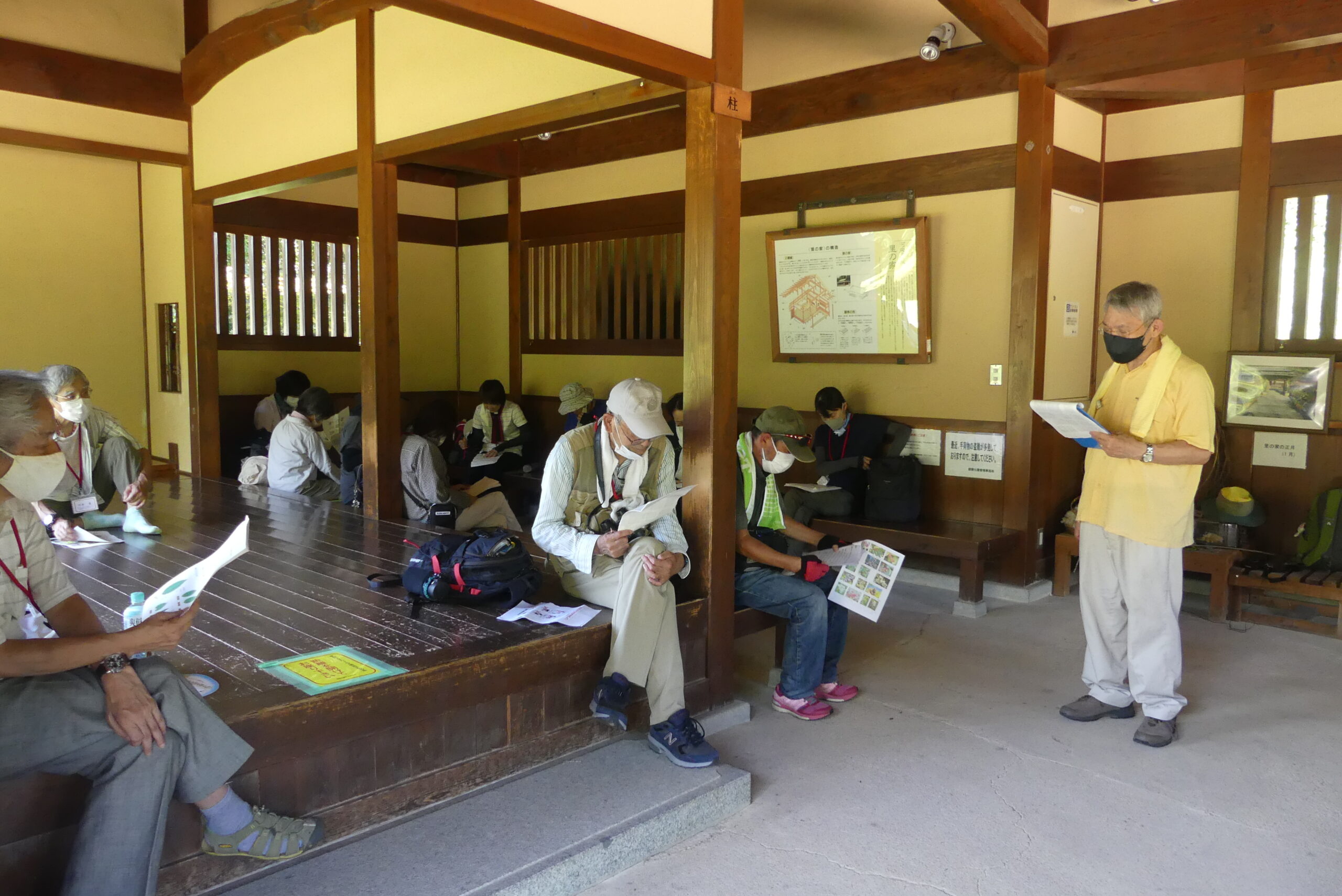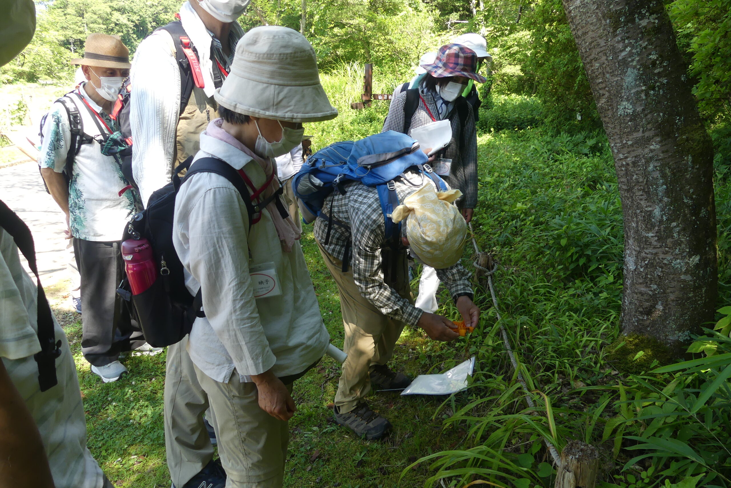 時々止まって説明を受ける時、今回は先生が三人いらっしゃるので、密になること無くしっかり聞くことが出来た。途中、大きな松ぼっくりを拾って種の形を調べたり、黄色のきのこを見つけて名前や食べられるか?などの質問をしたりして、先生方との観察は楽しそうだ。