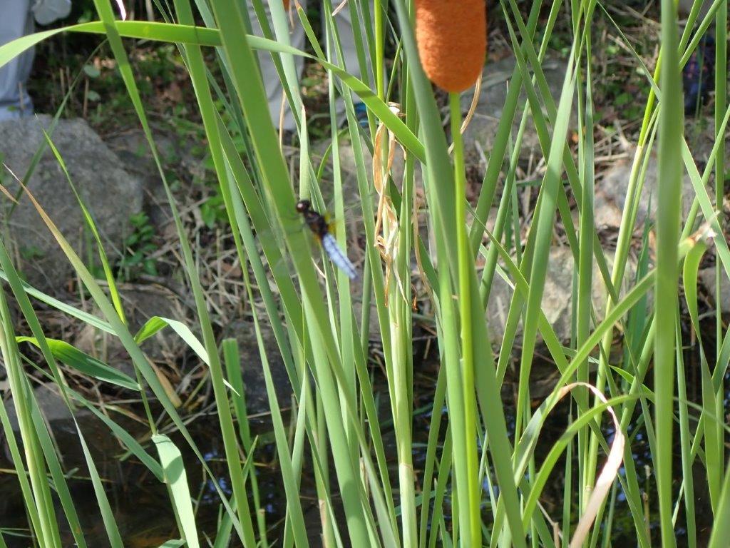ビオトープ池を縄張りにしているシオカラトンボがヒメガマで一休み