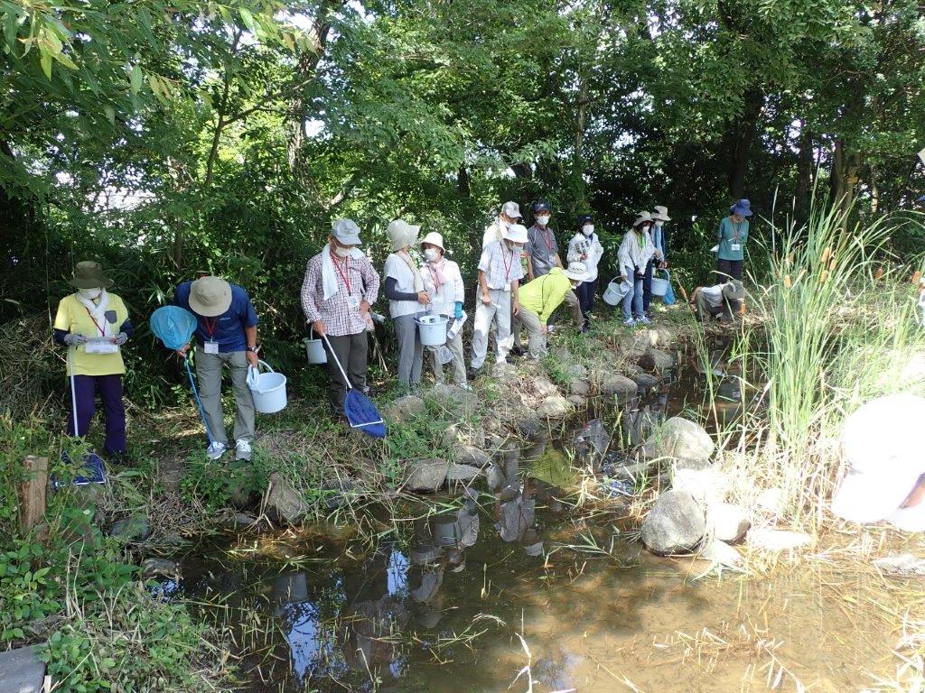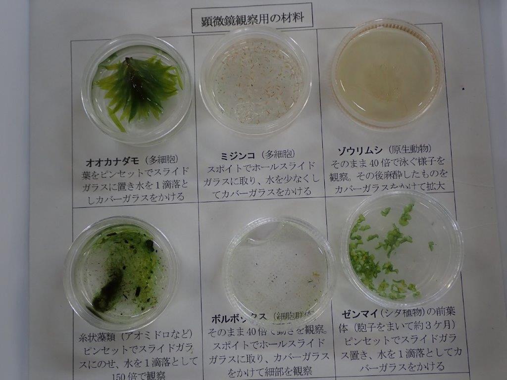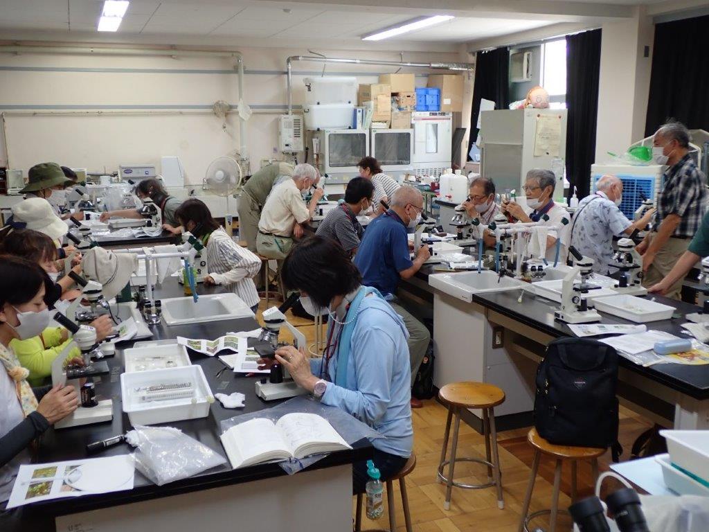 池の周囲の草刈りをやり過ぎたせいで観察出来る植物が少なかったがガマ、ヒメガマ、ヨシ、オオミクリ、ガガブタ、マルバヤナギ、ノハナショウブ、キショウブなどの説明があり、網で池の植物の天敵のザリガニやヌマガエル、アメンボウ、ヤゴ等の採取を楽しんだ後は生物実験室でオオカナダモ、ミジンコなど10種類の顕微鏡観察である。皆、現役学生にタイムスリップして先生の説明を聞くのもそこそこで顕微鏡を覗き込み細胞やミジンコの心臓の動きなど観察して時間がたつのを忘れてワイワイ!ガヤガヤ!盛り上がりました。