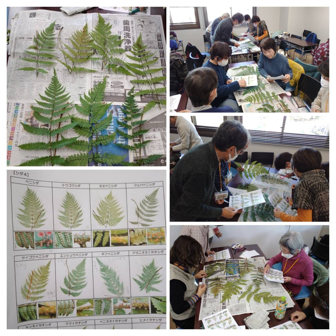 午前中の座学では「シダ植物」の世代交代や部位の名称、葉身の形や胞子葉と栄養葉、胞子嚢群のつき方などを学んだ。その後用意された数種類のシダの葉身を使い、グル-プ別に同定作業を行った。葉のツヤや柔らかさ、先端の鋸歯や葉柄の色、鱗片・羽片・小羽片の形など見分方法を講師から教わったが同定はなかなか難しい。賑やかに意見が飛び交い、ワイワイガヤガヤと熱心に昼食の時間を忘れて同定作業をした。