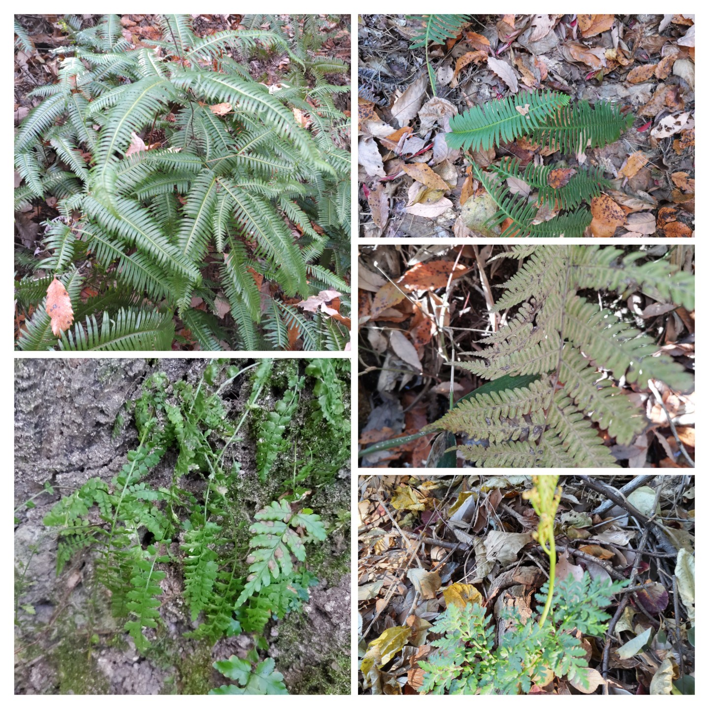 左上から時計回りに、コシダ・シシガシラ・ハリガネワラビ・フユノハナワラビ・トラノオシダ