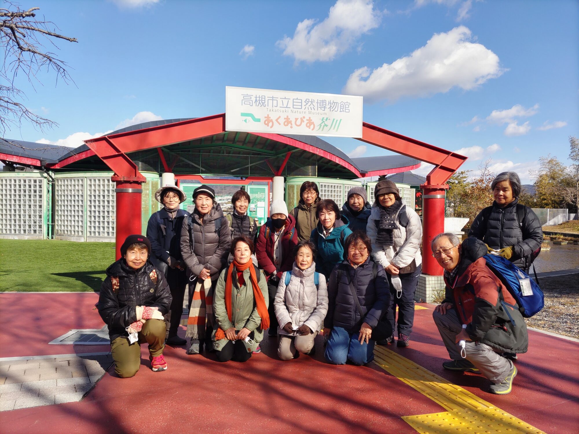 アクアピア芥川は高槻市の真ん中あたり、市街地と山地の中間、淀川に注ぐ芥川の川沿いにあった。芥川に生息する魚類を上流・中流・下流を模した水槽に展示、別のフロアには同様に高槻エリアに生息する哺乳類や鳥類の標本とはく製を展示していた。学芸員の丁寧な案内のあと自由に見学した。はく製や水槽などは目線近くに展示されており、講座生は「カメとにらめっこ」するなど、好きな動物をゆっくりとじっくりと観察することができた。なじみ深い動物が主であったが、大規模な博物館とは違い「味のある自然博物館」だった。