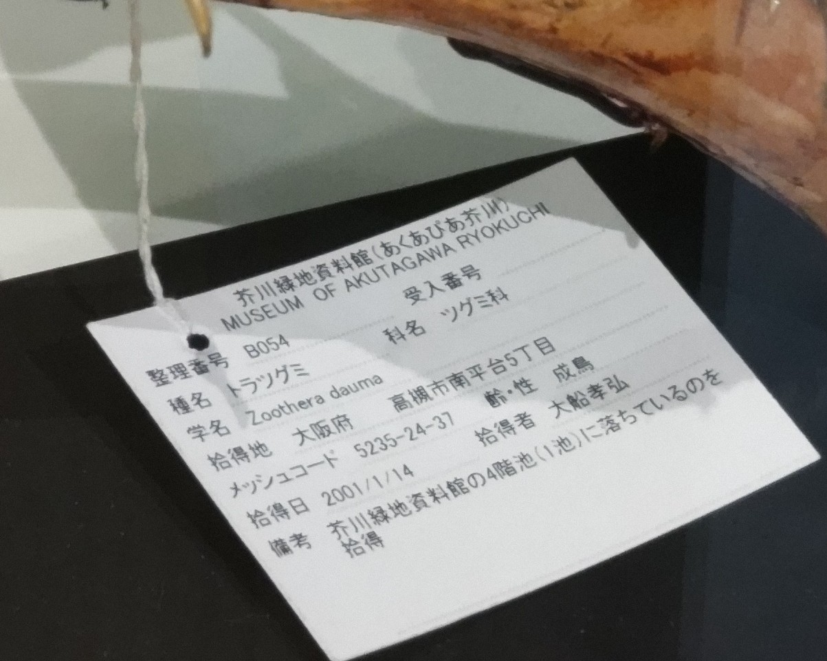 はく製の展示ラベル、何をいつどこで見つけたかをしっかりと記録