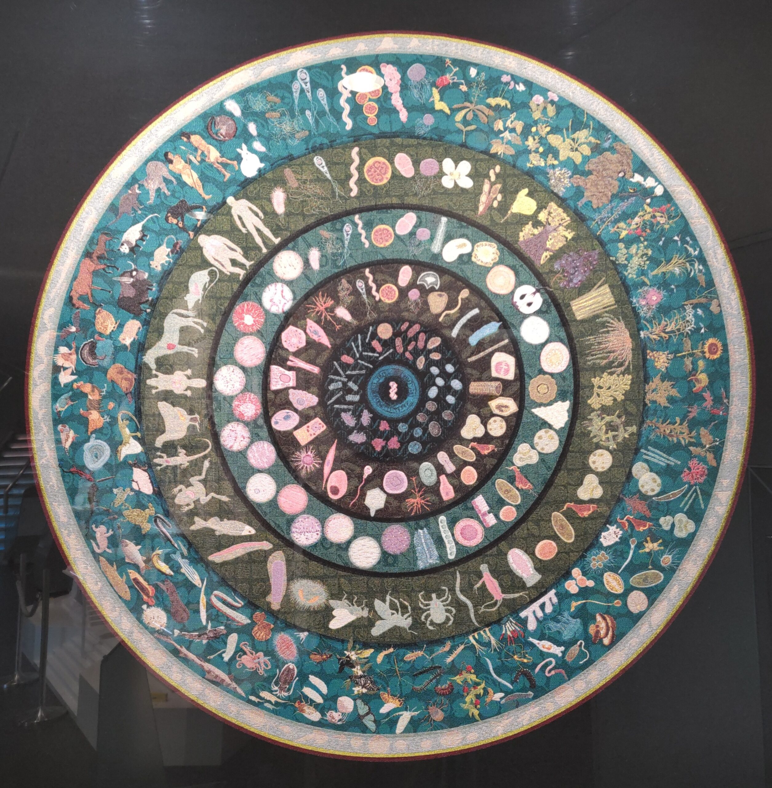 生命誌マンダラ、中心にゲノムがあり、細胞→組織→個体を表現。よく見るとみごとな織物でした。