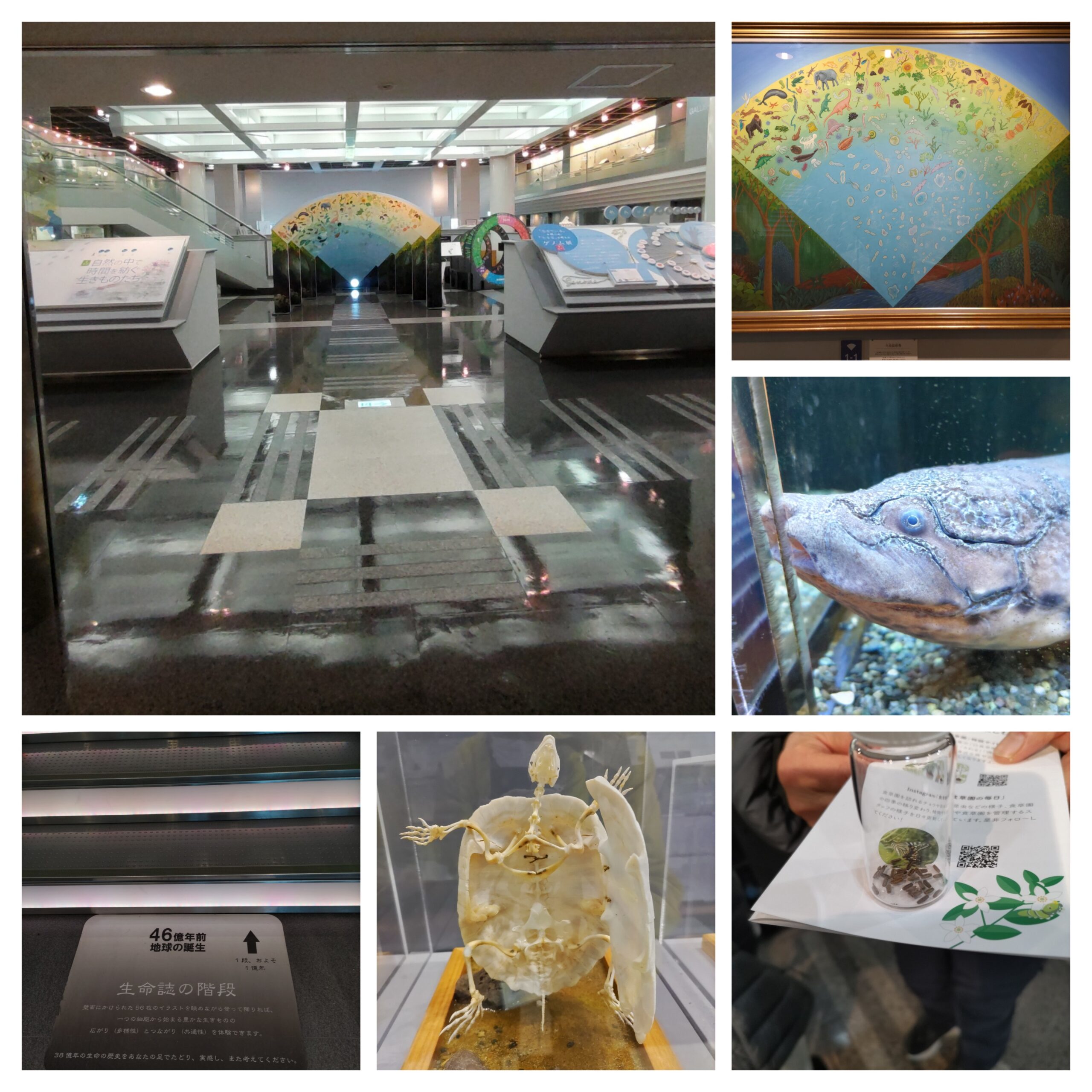 設立20年の研究や表現活動などを映像で学び、その後3班に分かれ、説明を伺いながら生命誕生後38億年の歴史に沿って生物進化を表現した展示フロアを見学した。「生命誌絵巻」や「生命誌マンダラ」は、すべての生き物は38億年前に生まれた生命体を先祖としそれぞれ進化してきた仲間であり、それぞれのDNAにその歴史が記録されていることが絵で表現されていた。