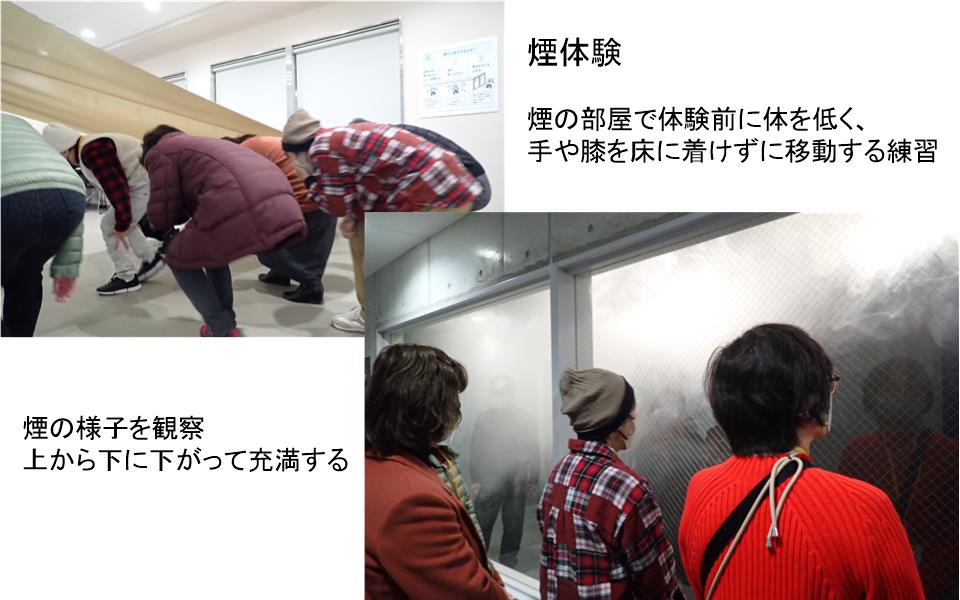 災害学習として最初に映像による地震の被害や対策、公助の限界、自助、共助の効果について説明を受けた。その後、体験学習。地震体験では阪神淡路大震災の直下型地震震度7、東日本大震災の海溝型地震震度6.5の揺れを体験した。次に消火活動について。練習用水消火器を用いて3メートル離れた安全な位置で風上から燃えているものにかける。消火器による消火時間は15秒間と教わった。次に煙体験と暗闇体験。低い姿勢で煙を吸い込まないように、危険なので床に手や膝をつかないようにと注意を聞いてから体験。視界が利かない中、手探りで出口を目指す難しさを感じた。
