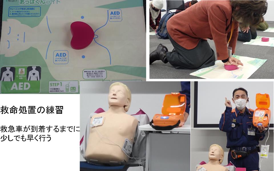 心肺蘇生については心臓マッサージの練習とAEDの操作についての説明を受けた。救急車が到着するまで8分30秒かかると言われ、そばにいる人による救急蘇生がなければ救命率が大きく損なわれることを学んだ。自治体の活動においても防災訓練は行われて多くの人はそれぞれ経験しているが実際に起こった場合に備えて広く知識を得、何度も経験を積むことが必要だと感じた。