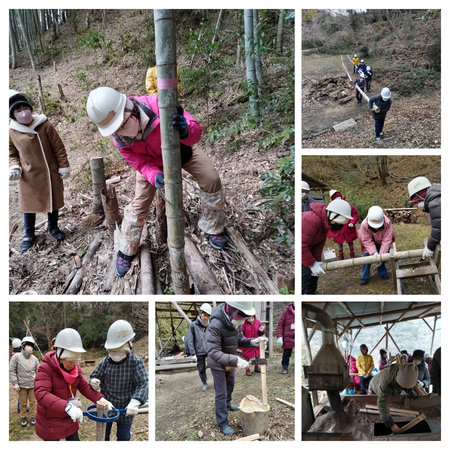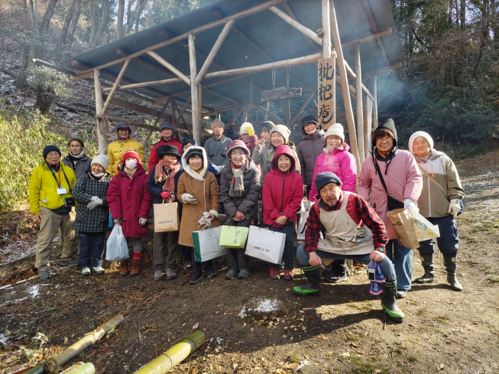 今年一番の寒気が予想され時折雪が降る中、富田林の奥の谷にある竹林の竹伐採作業と伐採した竹を使った竹炭作りを体験した。