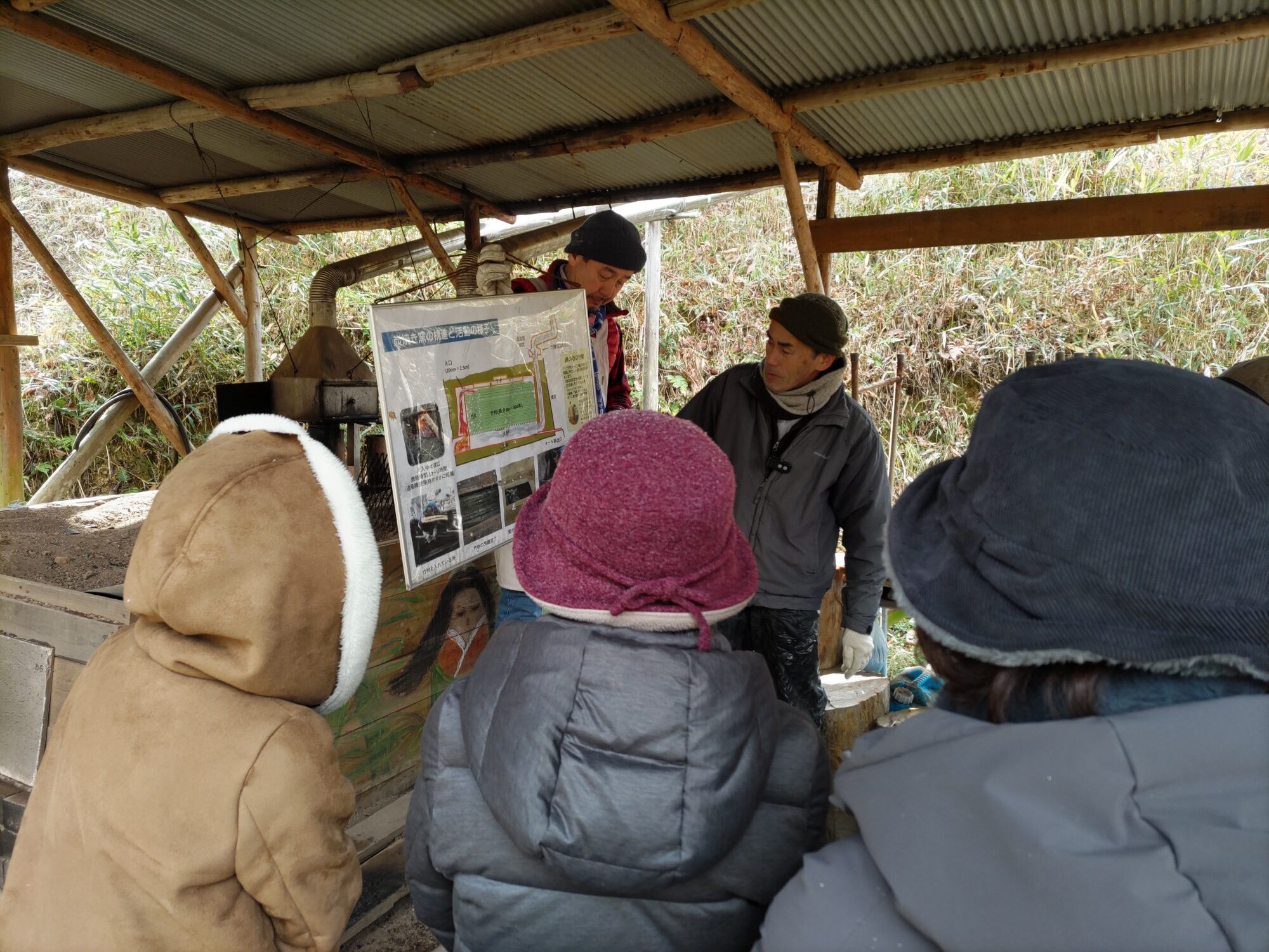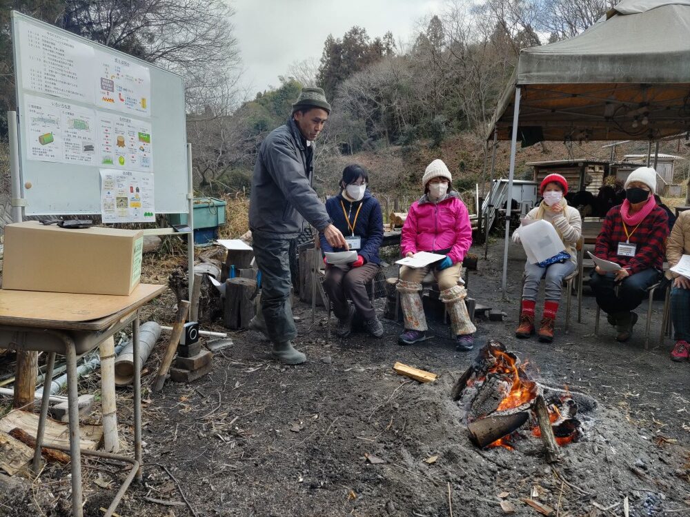 焚火を囲んだ青天井の教室で、なぜ竹の伐採と竹炭作りをするか、その目的と炭焼きの知識を教わることから始まった。竹は成長や根はりの速さからまたたく間に里山中に広がる。竹を伐採するのだが、伐採だけでは竹の処分に困ることになる。奥の谷では竹の細い先端はチッパーで粉砕し、下の太い幹部分をドラム缶燃焼で竹炭を作っている。粉砕したチップはマルチや発酵や土壌改良剤として再利用し、その幹は竹炭にして脱臭剤・吸湿材・燃料として利用する。竹が光合成で体内に取り込んだ二酸化炭素を炭やチップの形に変えることで、土の中などに二酸化炭素を閉じ込める役割を果たしていると学んだ。