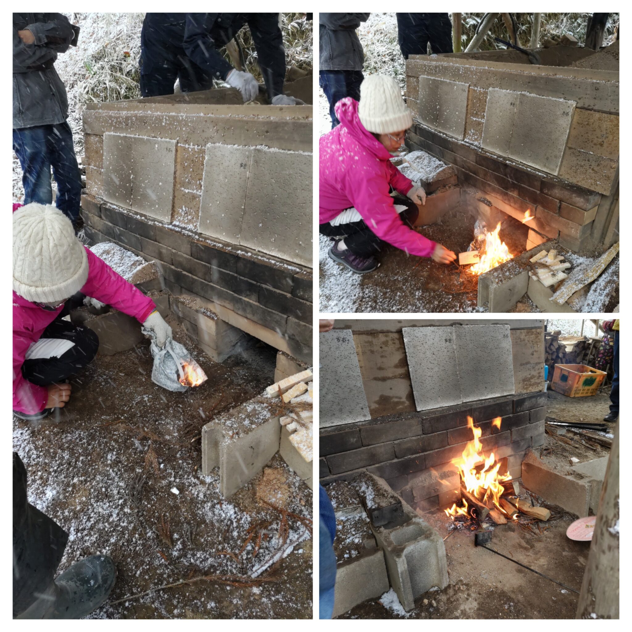 昼からは時折雪が激しく舞い奥の谷一面が真っ白になった。講座生は小さな雪だるまを作ったり、出来上がっていた竹炭を頂いたり、童心に戻って一日楽しく学んだ。(H.I)