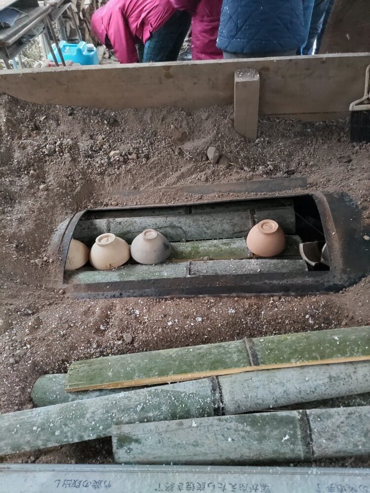 充填された炉の中、特別に茶碗も焼く。茶碗は真っ黒に出来上がる。
