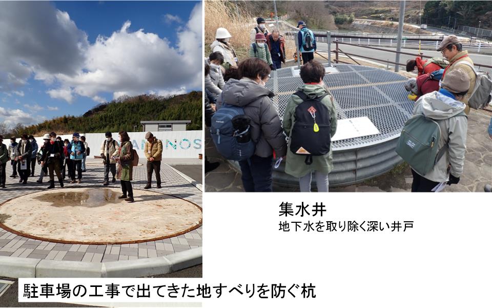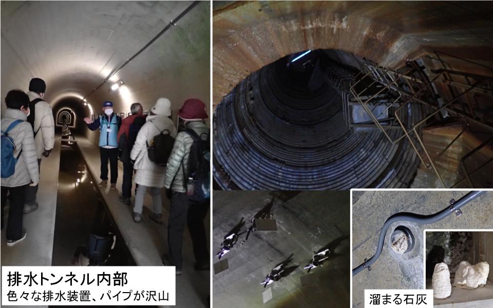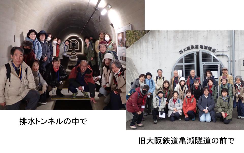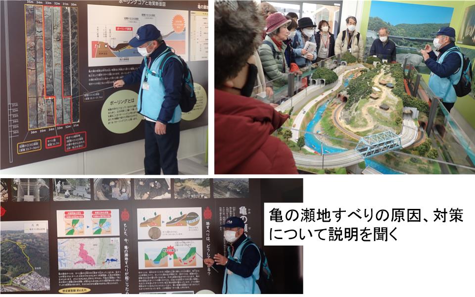午前は、亀の瀬地すべりインフラツーリズムのボランティアガイドによる「亀の瀬地すべり歴史資料室」「1号排水トンネル」「旧大阪鉄道亀瀬隧道(亀瀬隧道遺構)」の説明で見学した。