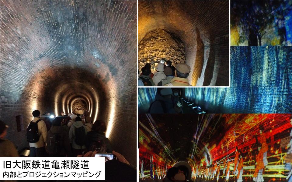 大阪府と奈良県の府県境に位置する亀の瀬地すべり。昭和6年に発生した地すべりでは大和川がせき止められ、鉄道のトンネルも圧壊した。地すべり対策はほとんどが地下構造物で、山の中には地すべりを止めるために、たくさんの杭や排水トンネルなどがあり、地上からは見ることができない。亀瀬資料室では地すべり被害状況やメカニズムなどを模型やパネルで詳しく説明を受け、その後排水トンネルなどの対策施設を見学した。昭和7年に潰れずに残った鉄道トンネル「旧大阪鉄道亀瀬隧道」では、当時の建築技術と災害の歴史を今に伝えている。イギリス積みの煉瓦壁、蒸気機関車の黒いすす跡の残る天井、崩落面など遺構がライトアップされていた。そしてトンネル内に映し出されるプロジェクションマッピング を楽しんだ。ガイドの提案で大和川に姿を見せていた亀石の説明も受ける事ができた。
