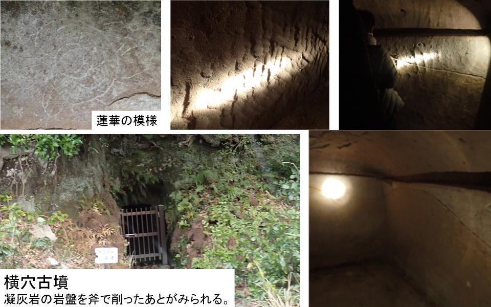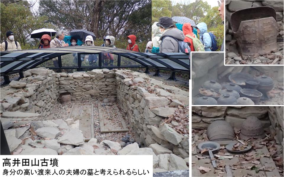 最後に雪がちらつく中、古墳の見学。先に横穴よりも100年ほど古い高井田山古墳の石室を見学した。次に、6世紀中頃から7世紀前半に造られた高井田横穴古墳では、古墳の内部で凝灰岩の岩盤を鍬や手斧で洞窟のように掘り複数の遺体を埋葬していたと説明を受けた。手掘りでは掘り手の個性が現れ右利き左利き、几帳面かどうかなど想像できるとの話でいっそう興味を持てた。