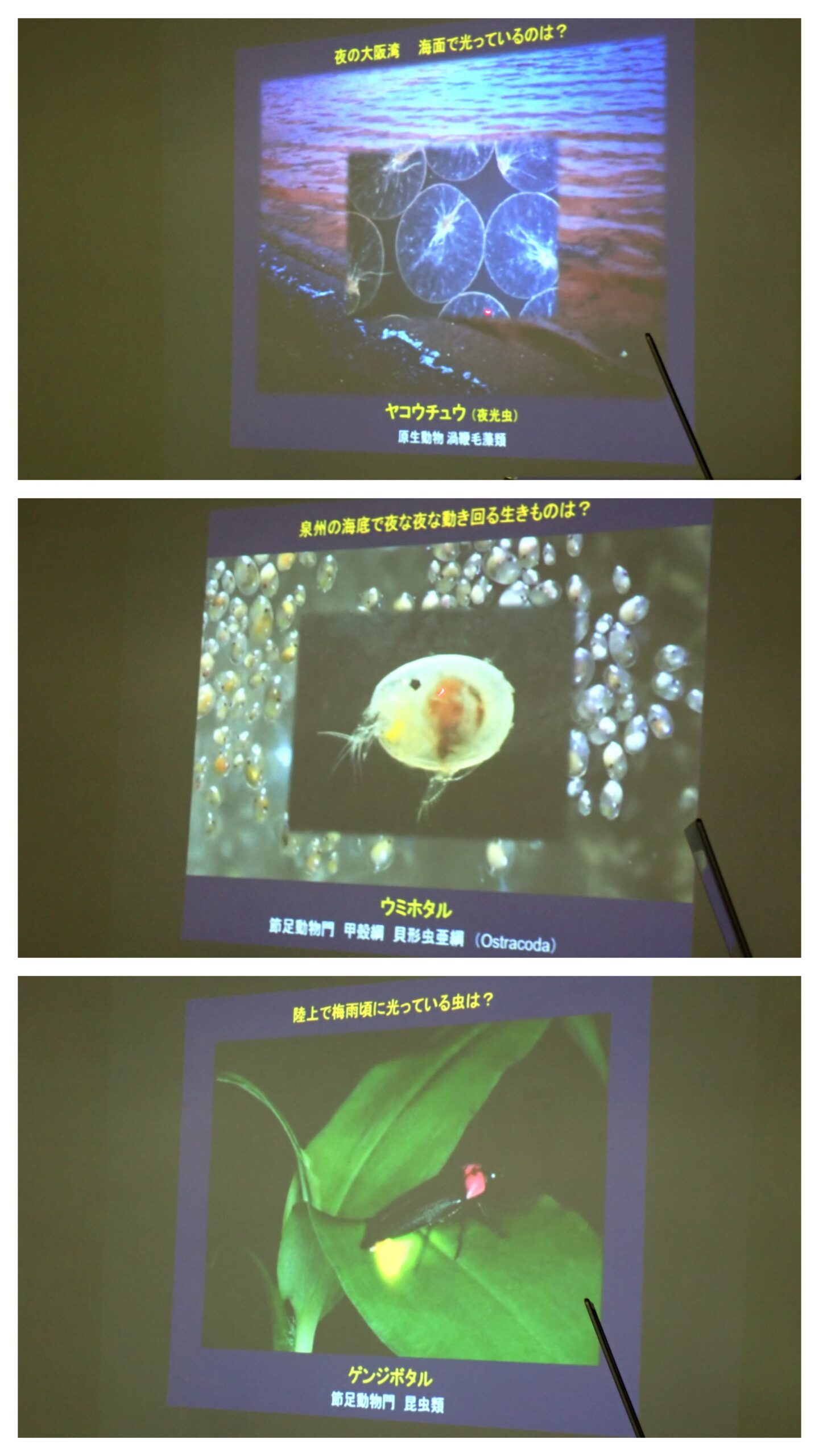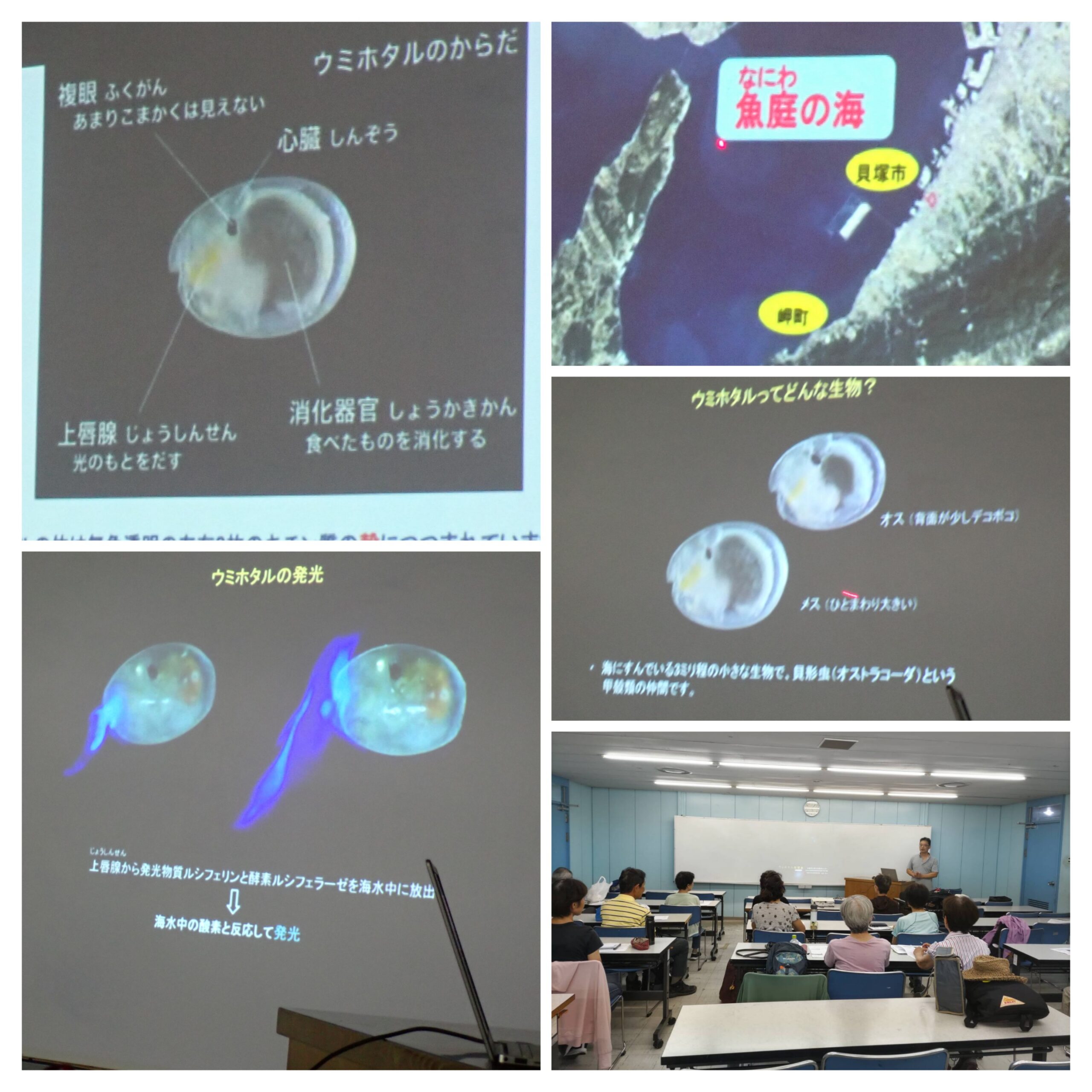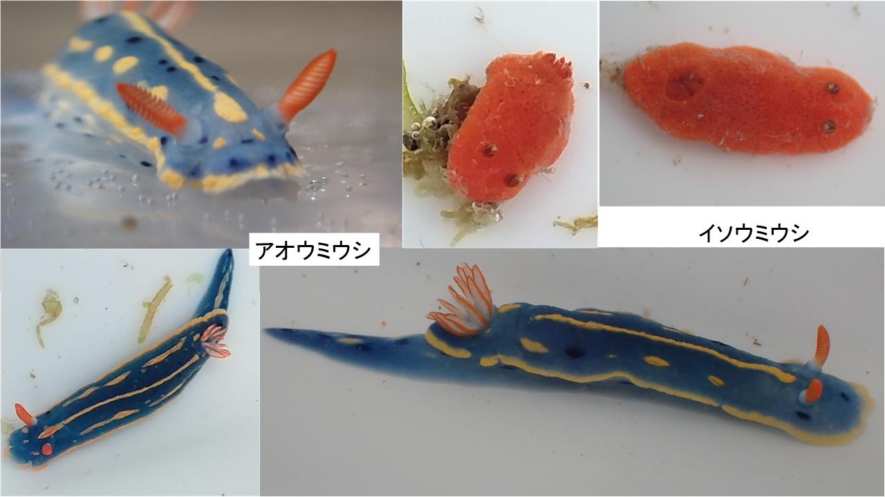 2mm位のオカダウミウシから15cm位のアメフラシまでサイズが色々、色形も様々。触角が2本突き出てそれを利用して水中で化学物質の匂いを感じている。派手な色は食べてもまずいと知らせるためのものらしい。ウミウシは進化の過程で巻き貝の貝殻が退化したもので、カイメンやイソギンチャクなどの美味しくないものを食べることで自身も美味しくない物質を体に蓄積し外敵から身を守る為の貝殻を必要としなくなった。アカボシウミウシのようにオカダウミウシを食べるウミウシもいるらしい。