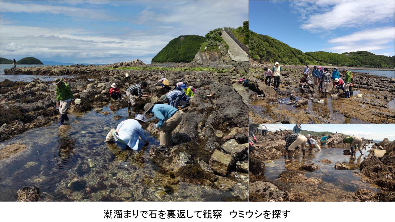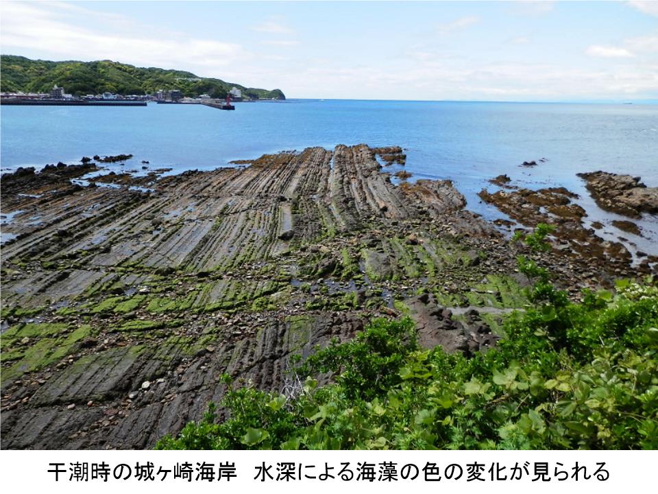 加太駅から徒歩35分程で城ヶ崎海岸に到着。空は晴れ渡り、海に浮かぶ島々を遠くまで見通すことができた。大潮の日で干潮が午前12時頃とウミウシの観察にぴったりの日和となった。この時期の海は海藻も美しく、干潮時には海水の浅い所に緑色の海藻が、中程では淡い黄色、遠くには褐色の分布が見られた。海藻の種類が変わればそこに住む魚や生物も変わる。日光の届き方や水深によって異なる生物の分布の事を層状分布(帯状分布)というそうだ。