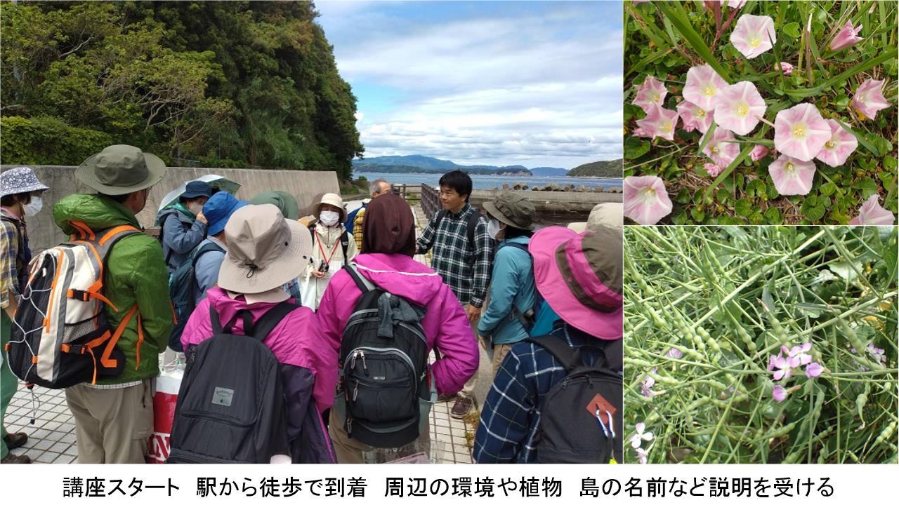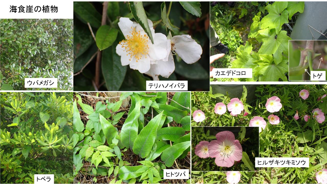 海食崖ではウバメガシ、トベラのようなしっかりした感触で光沢のある葉を持つものやネムノキ、アカメガシワ、スイカズラがみられた。クロマツは触れた瞬間痛いと声を上げるほど鋭かった。シダ類のオニヤマソテツやヒトツバなどが下方で見られ明るい草むらではナルトサワギキョウやヒルザキツキミソウ、スイカズラ、テリハノイバラの花が咲いていた。