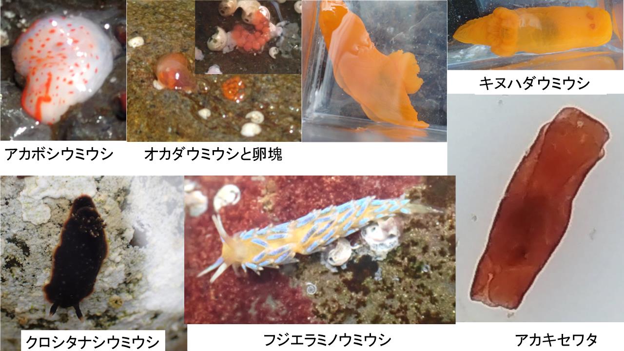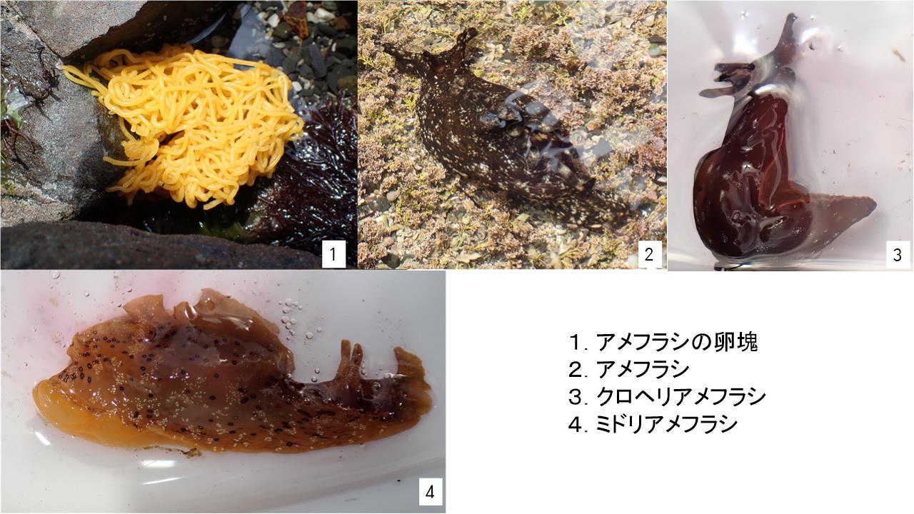 先生に頂いた「うみうしノート」という冊子を開いて春から夏にかけて見られるウミウシの説明を受けてから観察を始めた。最初にアメフラシの卵塊が見つかり大盛りあがり。後は、潮だまりでひたすら石をひっくり返して気になるものを見つけたら先生に声をかけて確認した。イソギンチャクやホヤ、ゴカイなどウミウシの餌になるものがわかるようになり、餌のある周辺をしっかり観察しているうちにしだいに見つけられるようになった。ぜひ見たかったアオウミウシや沢山のオカダウミウシが見つかりはじめた。オカダウミウシ以外を見つけようとがんばり、全部で11種類のウミウシを見つけることができた。