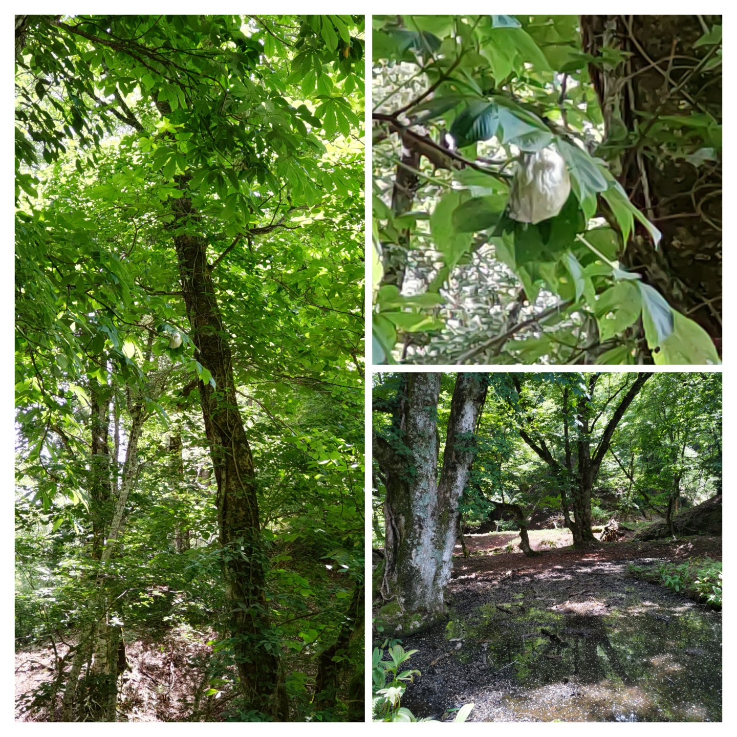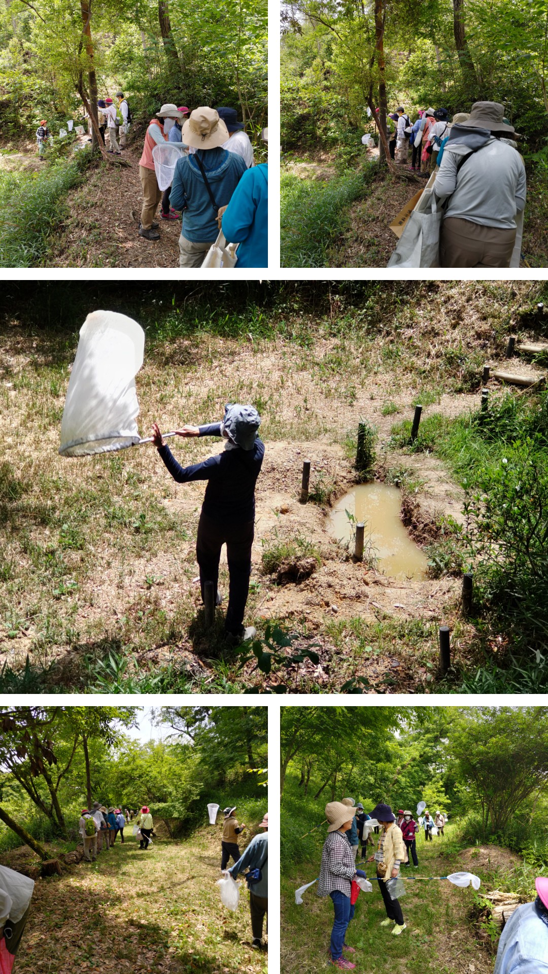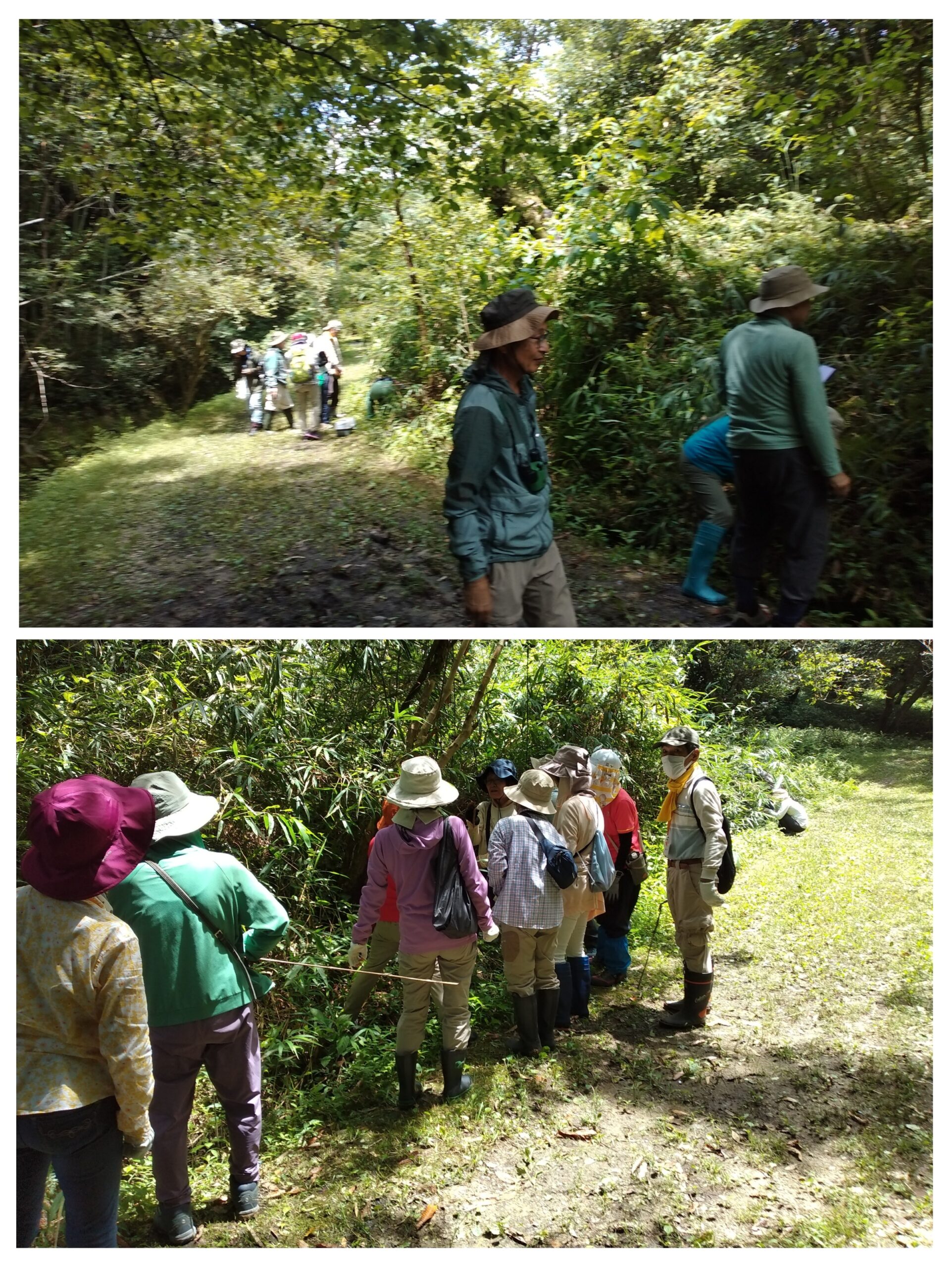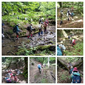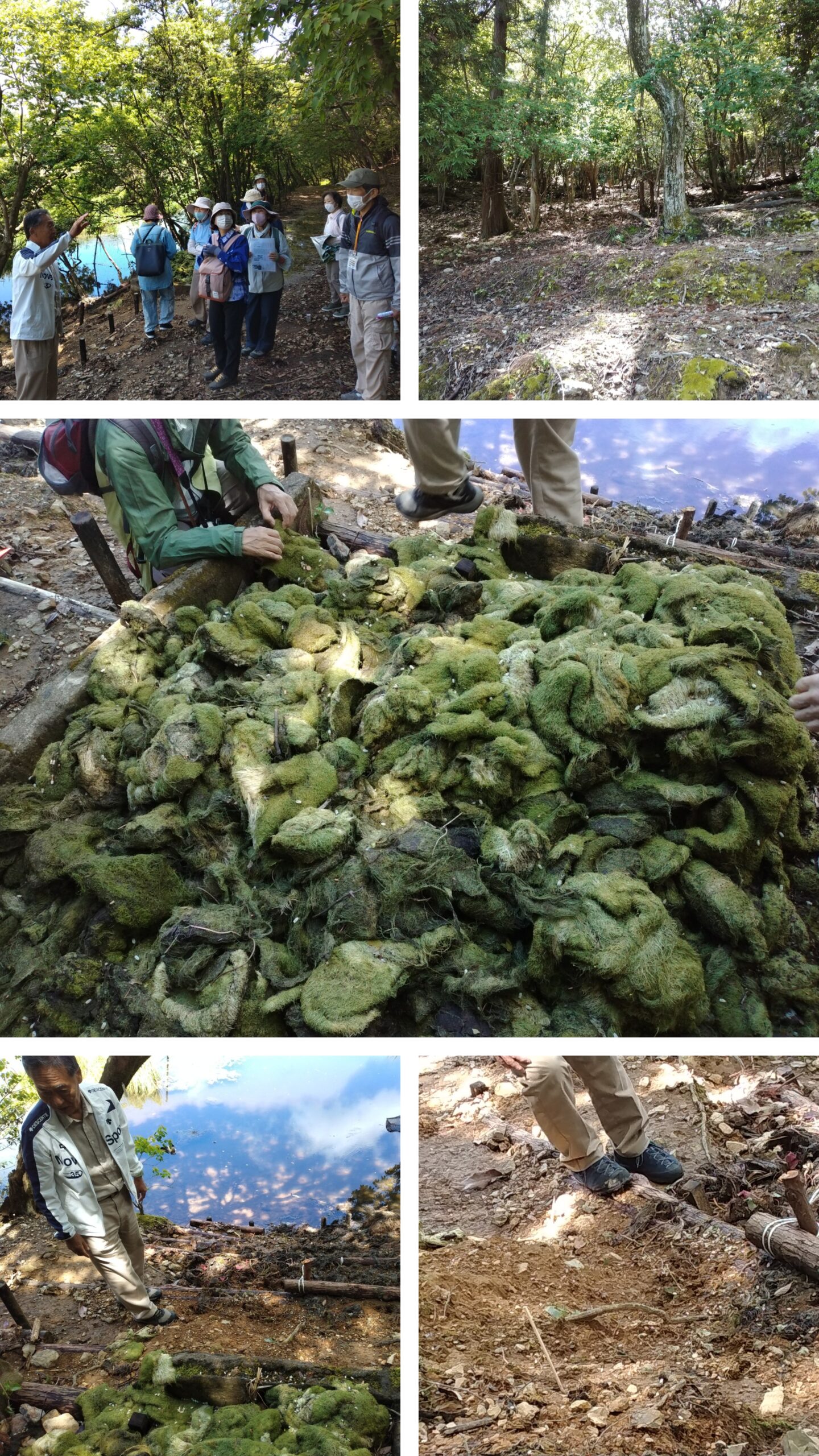 次に池の横の森の中へ。かつては段々畑があり、里山として日々の生活に密着して利用されていたが薄暗い森に。足元には処理されたオオバナノイトタヌキモと茎を切られたジュンサイの根が山盛り!?のはずがジュンサイだけがない。ここにも○○の足跡が、これは今まで気づかなかった大発見だと写真を撮る先生。浮島を寝床に絶滅危惧種を食い荒らすだけでなく、生ごみ処理をしてくれていたことに驚き(笑い)。