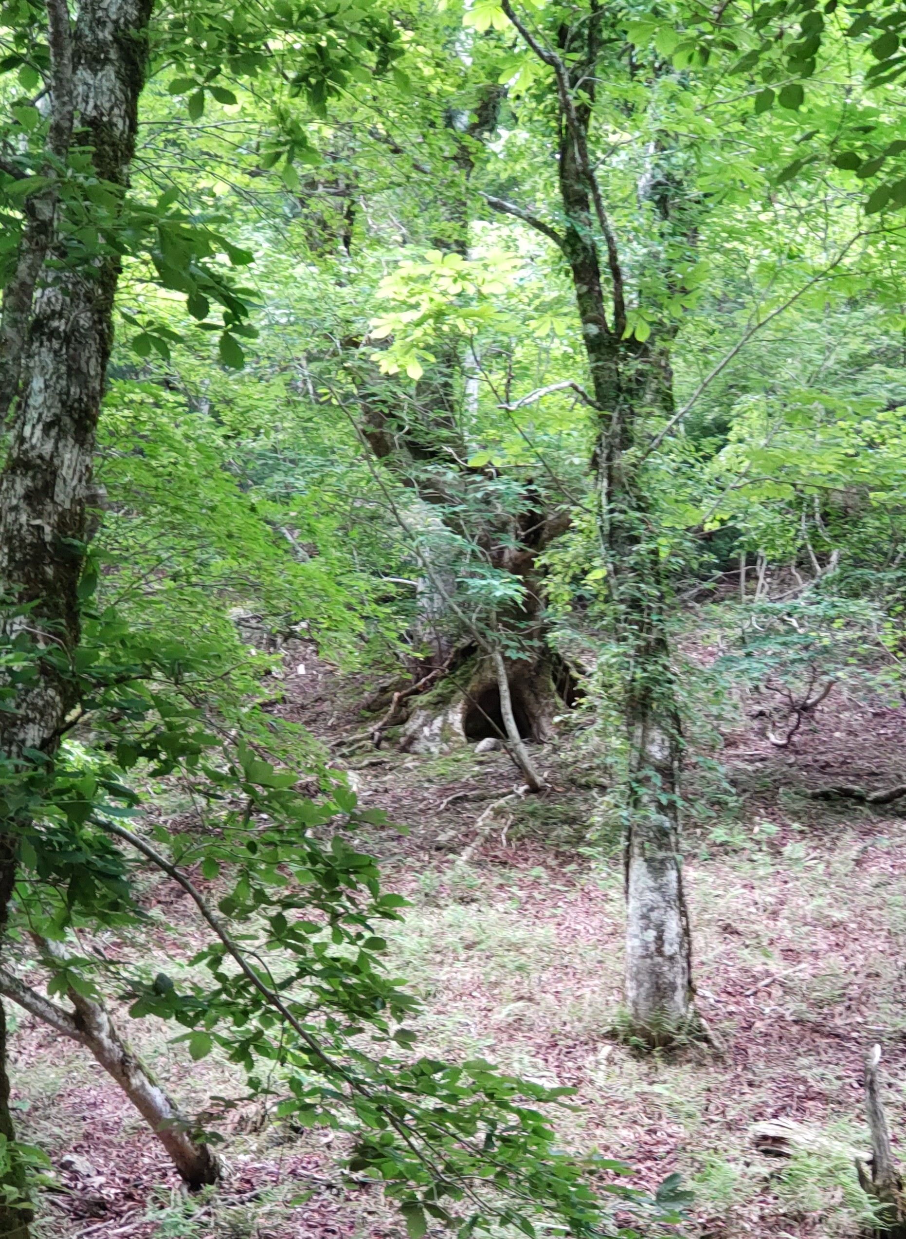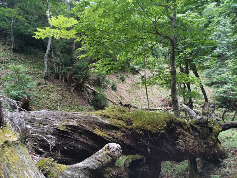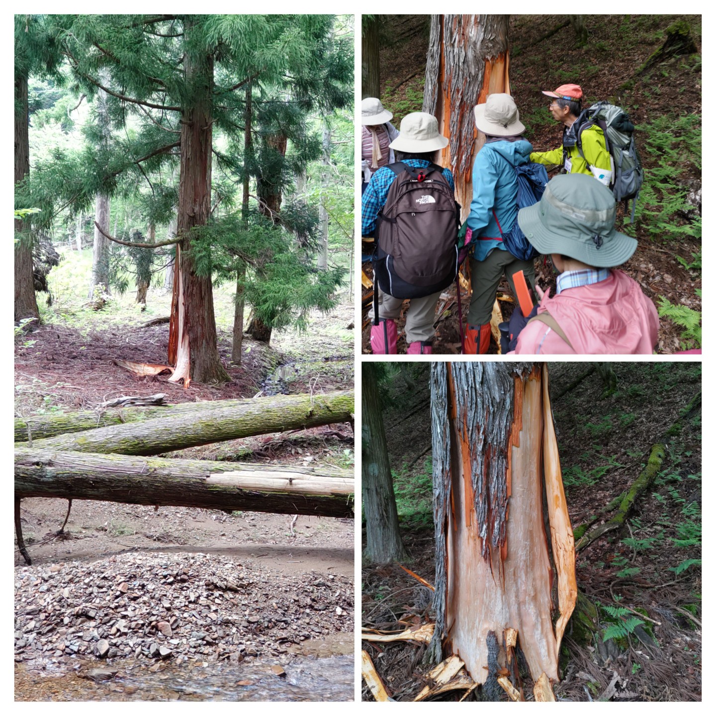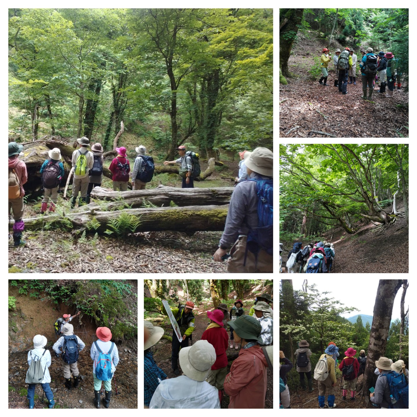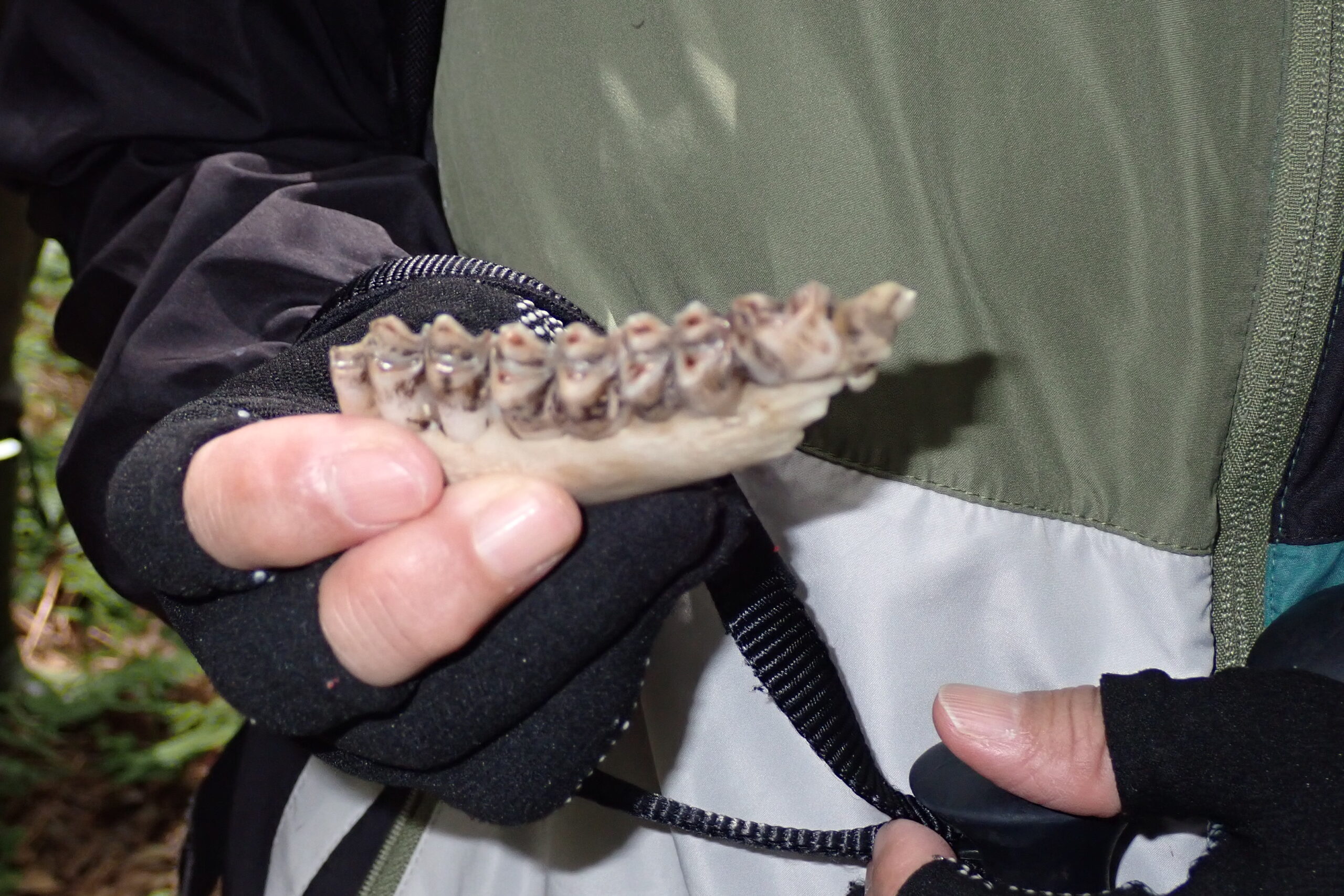 次に池の横の森の中へ。かつては段々畑があり、里山として日々の生活に密着して利用されていたが薄暗い森に。足元には処理されたオオバナノイトタヌキモと茎を切られたジュンサイの根が山盛り!?のはずがジュンサイだけがない。ここにも○○の足跡が、これは今まで気づかなかった大発見だと写真を撮る先生。浮島を寝床に絶滅危惧種を食い荒らすだけでなく、生ごみ処理をしてくれていたことに驚き(笑い)。