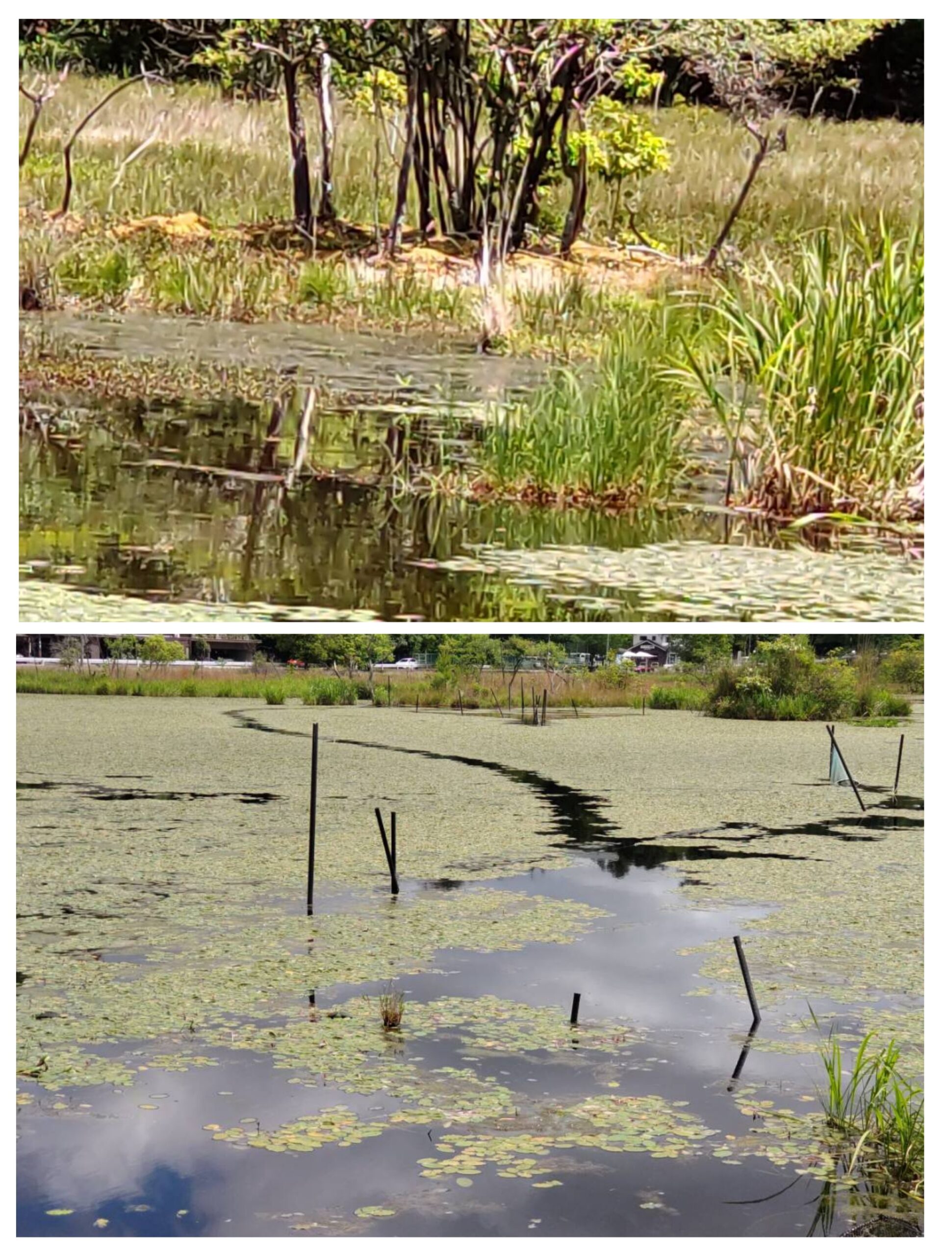 浮島がよく見える場所へ。奥にヒメコウホネの黄色い花が見える。左、シカが通る場所とシカから保護された場所、カムルチの稚魚
