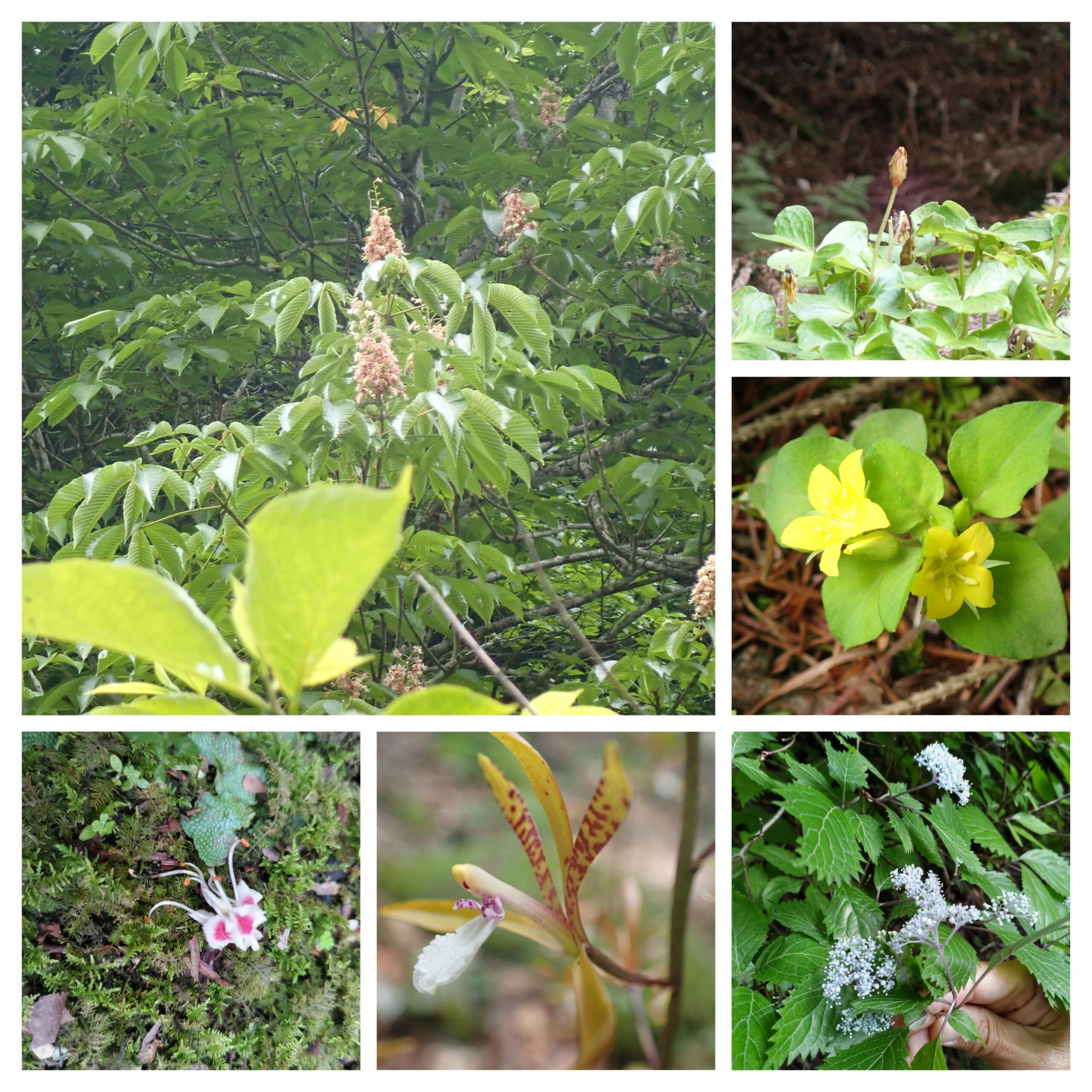 下左から、シカの足跡、オオバナノイトタヌキモとジュンサイ、ジュンサイの花