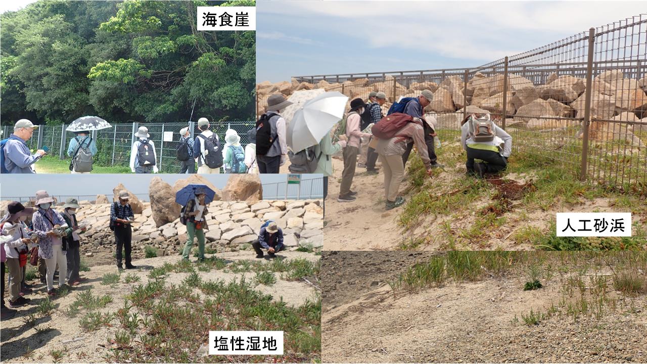淡輪駅から公園に向かう道中から観察は始まりゴツゴツした海食崖、人口砂浜、塩性湿地、河口湿地という異なった環境の植生を見ることができた。