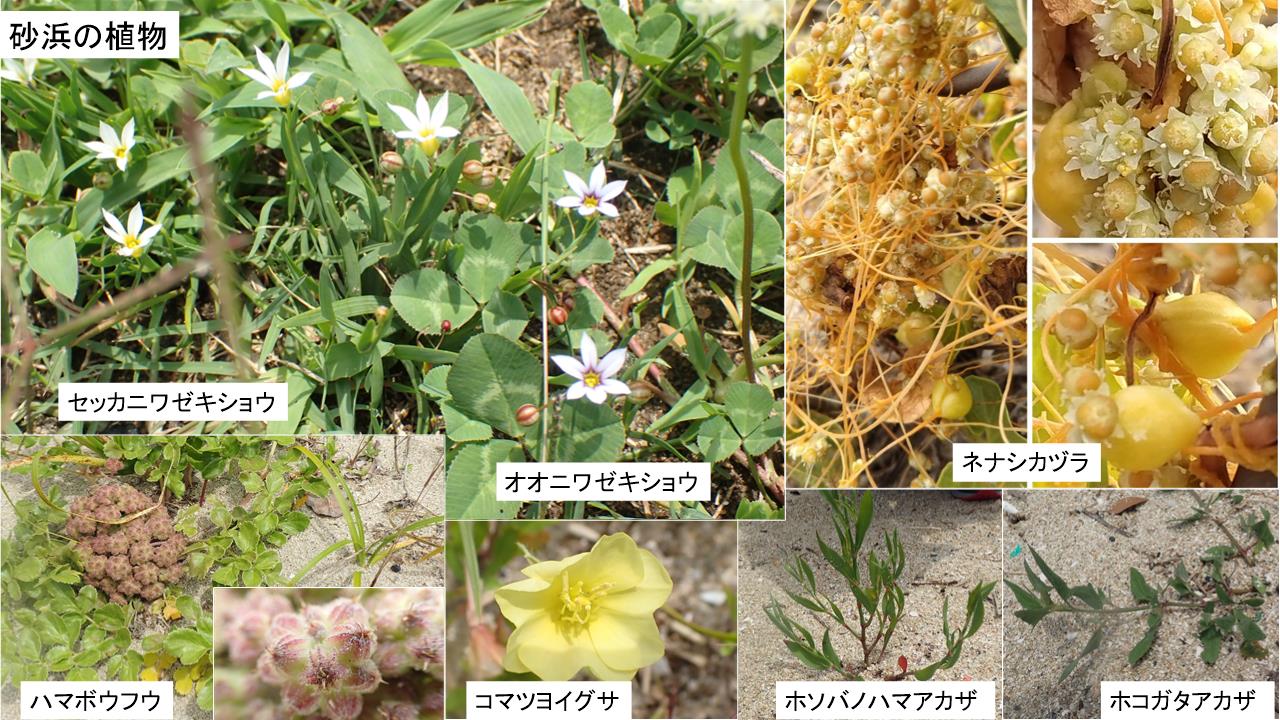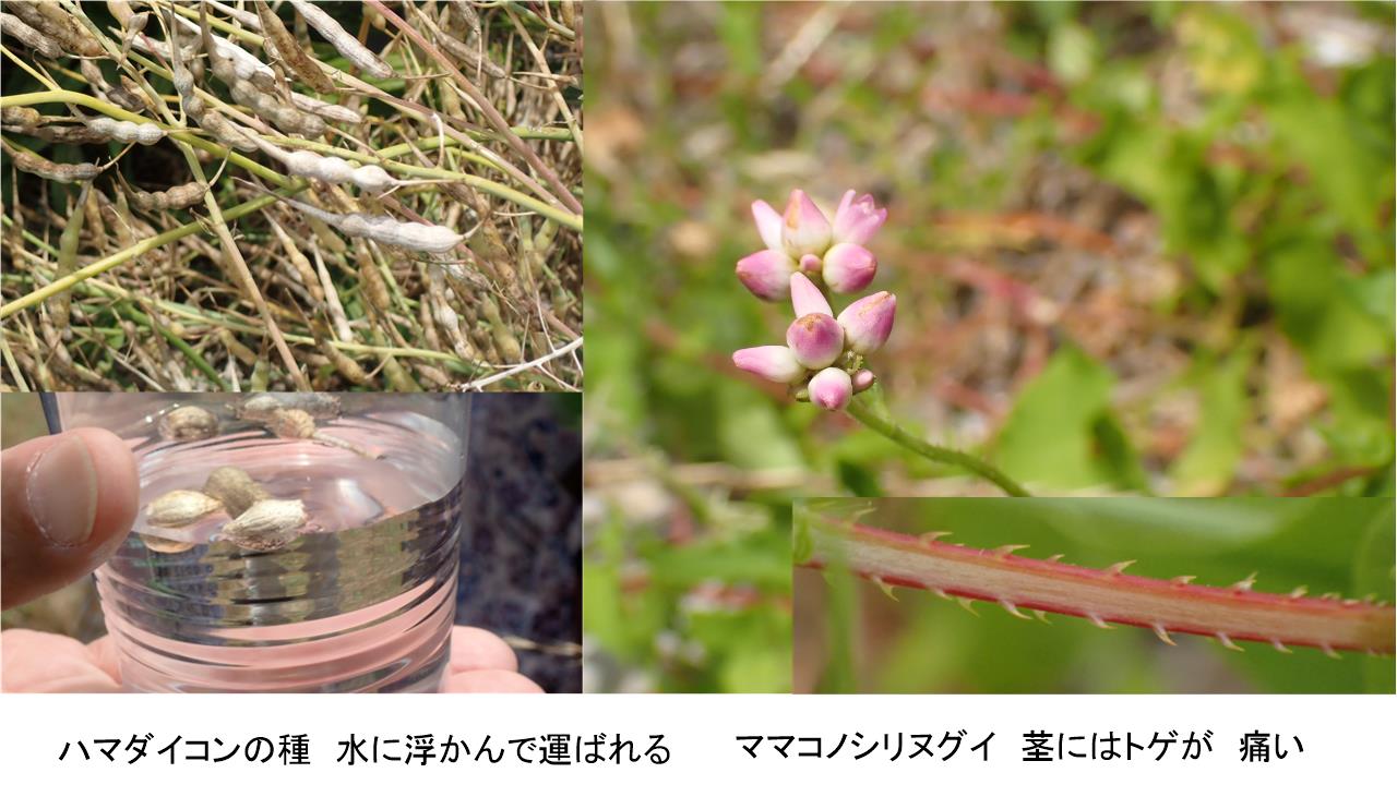 砂浜ではハマダイコンの種、ツルナ、ヘラオオバコ、ハマヒルガオ、オカヒジキそしてママコノシリヌグイという恐ろしい名前の植物がみられた。肉厚の葉を持ち根は細くても深く砂の中に伸びている様子が観察できた。