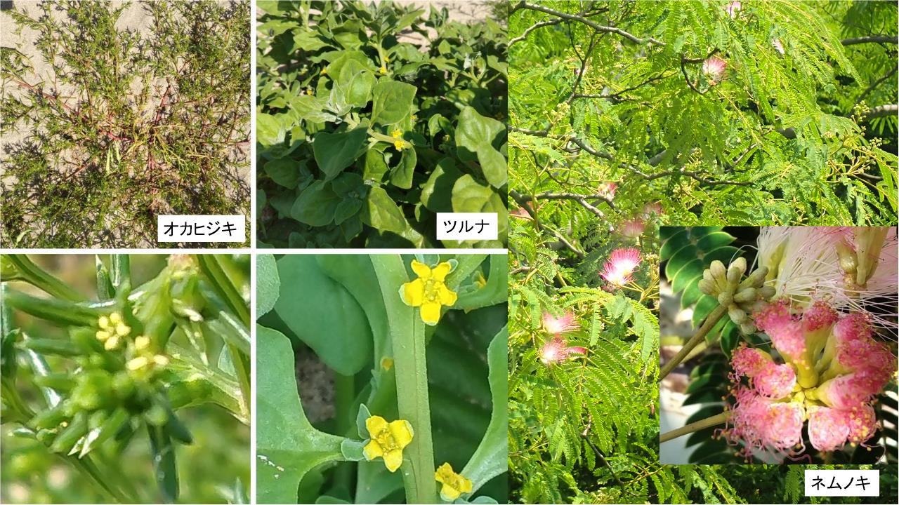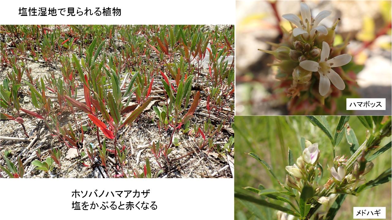 塩性湿地では潮の満ち引きによって海水の影響を受けても耐えられる植物がみられた。特にホソバノハマアカザが海水をかぶると赤くなる事を知った。オカヒジキが砂浜に這うように広がっている様子が興味深かった。海岸は石組みで整備されフェンスで囲まれたところではコウボウムギ、コマツヨイグサが広がりフェンスの近くではネナシカズラという不思議な植物に注目した。