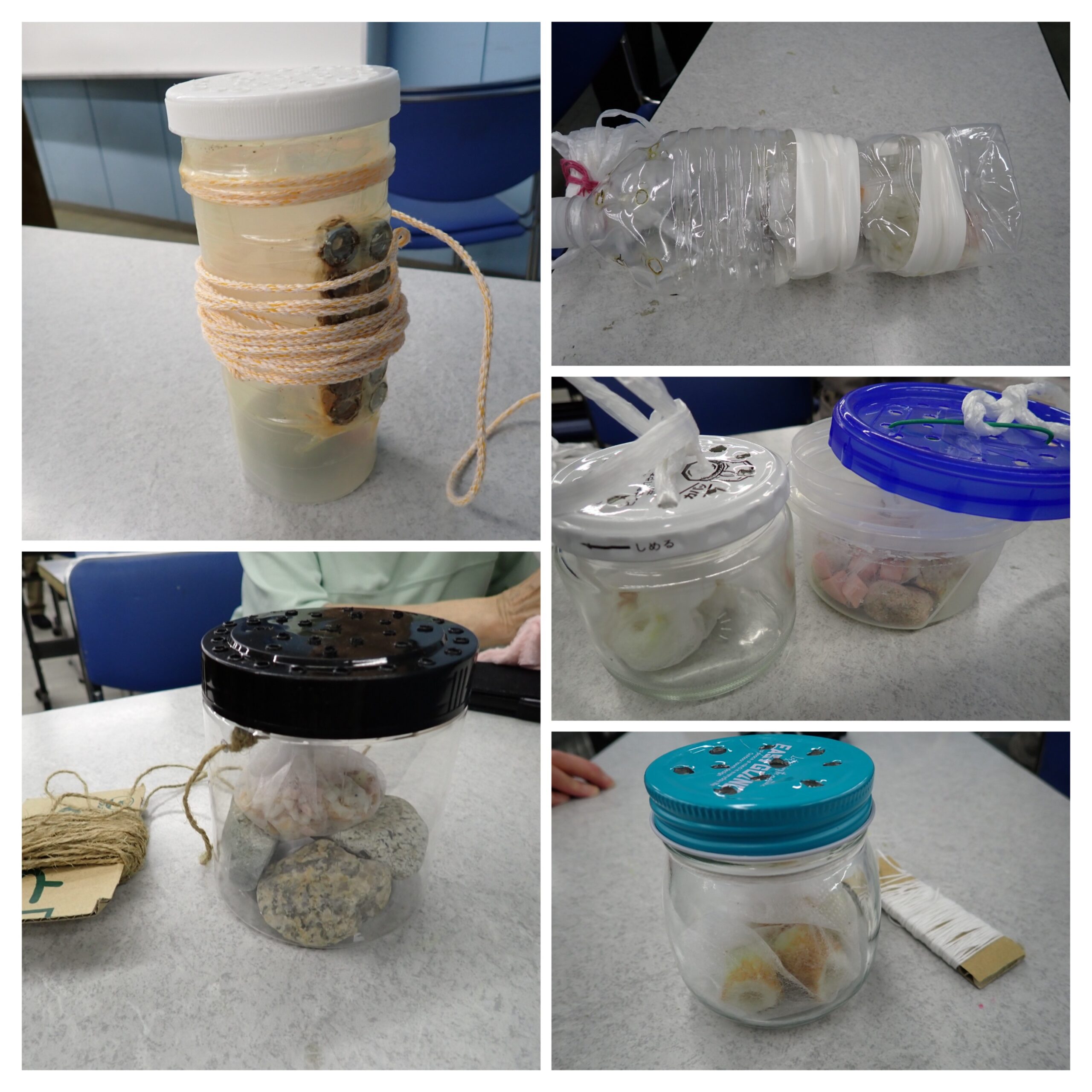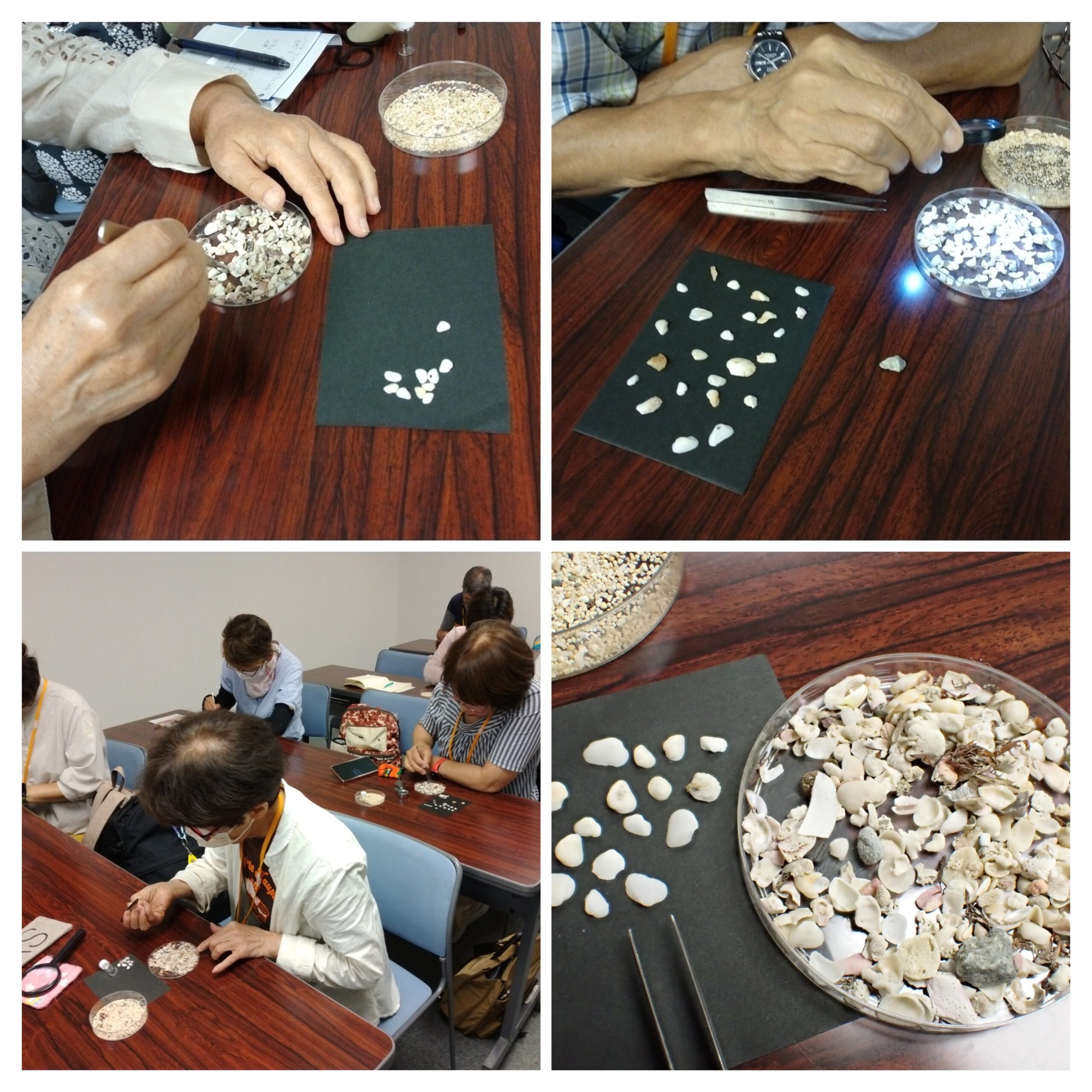 まず、沖永良部島の砂から星砂を見つける。みんな真剣だ。よく見ると星形のもの以外に丸っこいものも。いずれも有孔虫の死骸からできたものだと。さらによく見ると小さな貝も混じっている。