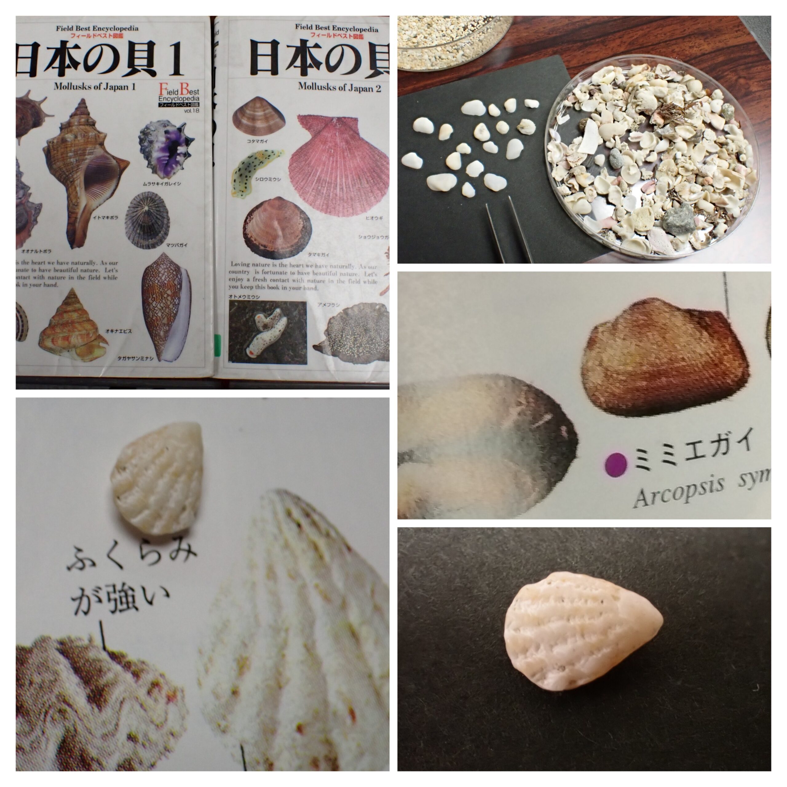 次に海岸で採取し、ふるいにかけた(微小貝を除いた)中から2枚貝を探す。よく似たものがほとんどで、ミミエガイの茶色の皮がとれたものだとか。2枚貝は種類が少ないことを確認。